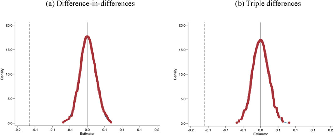 Robustness tests were conducted from time and individual to ensure the robustness of the regression results. The parallel trend test was used in time to test whether there was a significant difference between the treatment and control groups before the policy was implemented, and the placebo test was used in individual to randomly select the treatment and control groups to test the effect of counterfactual policy implementation.