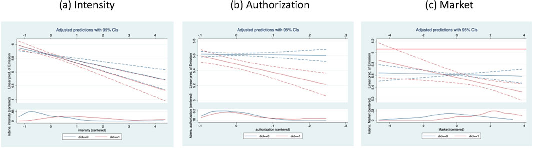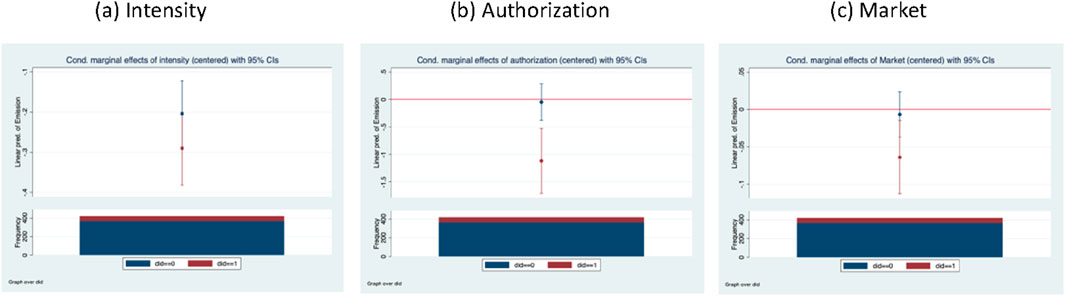 Figure 4. Marginal effects of carbon trading policy on carbon emissions. (a) Intensity. (b) Authorization. (c) Market.