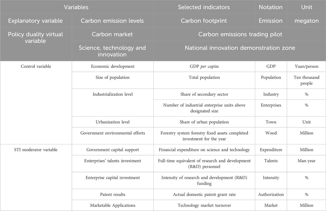 The study takes 30 provincial administrative units in China as the research object, excluding the sample of Tibet, and selects the panel data from 2008-2021 to evaluate the effect of carbon emissions trading policy and its synergistic effect with STI policy based on the multi-temporal difference-in-differences model and triple-differences model. All data are from China Carbon Accounting Database (CEADs) and the National Bureau of Statistics (NBS). The explanatory variables are the carbon emission level of each province and city, the core explanatory variables are the policy variables, the control variables were selected with reference to the existing literature, including the level of economic development, population, industrialization and urbanization, and the government’s environmental policy, while the moderating variables were selected according to the stages of STI, which are selected as follows. And the explanation of each indicator is shown in Table 1.