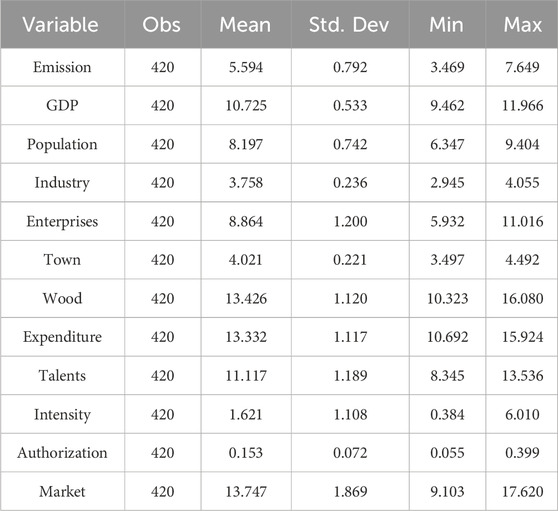 3. Among the control variables, GDP per capita is used to portray the level of economic development, the total population is used to portray the population size, the proportion of the secondary industry and the number of industrial units above the large-scale industry is used to portray the level of industrialization, the proportion of urban population is used to portray the level of urbanization, and the investment in forest fixed assets of the forestry system completed in the current year is used to portray the government’s environmental protection policy, capturing the scale of fiscal input into ecological conservation. In order to avoid the influence of extreme values, all the above continuous variables are reduced and logarithmised to a uniform scale.