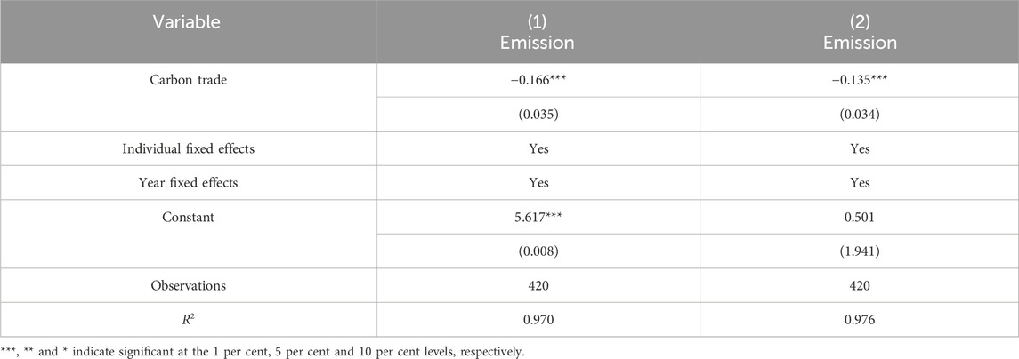 Table 3 reports the results of the regression of model (1) on the impact of the implementation of a single carbon trading policy on carbon emissions. Columns (1) and (2) report the positive impacts of carbon trading policy on carbon emission reductions. With the inclusion of control variables, each unit enhancement in policy implementation is able to significantly reduce carbon emissions by