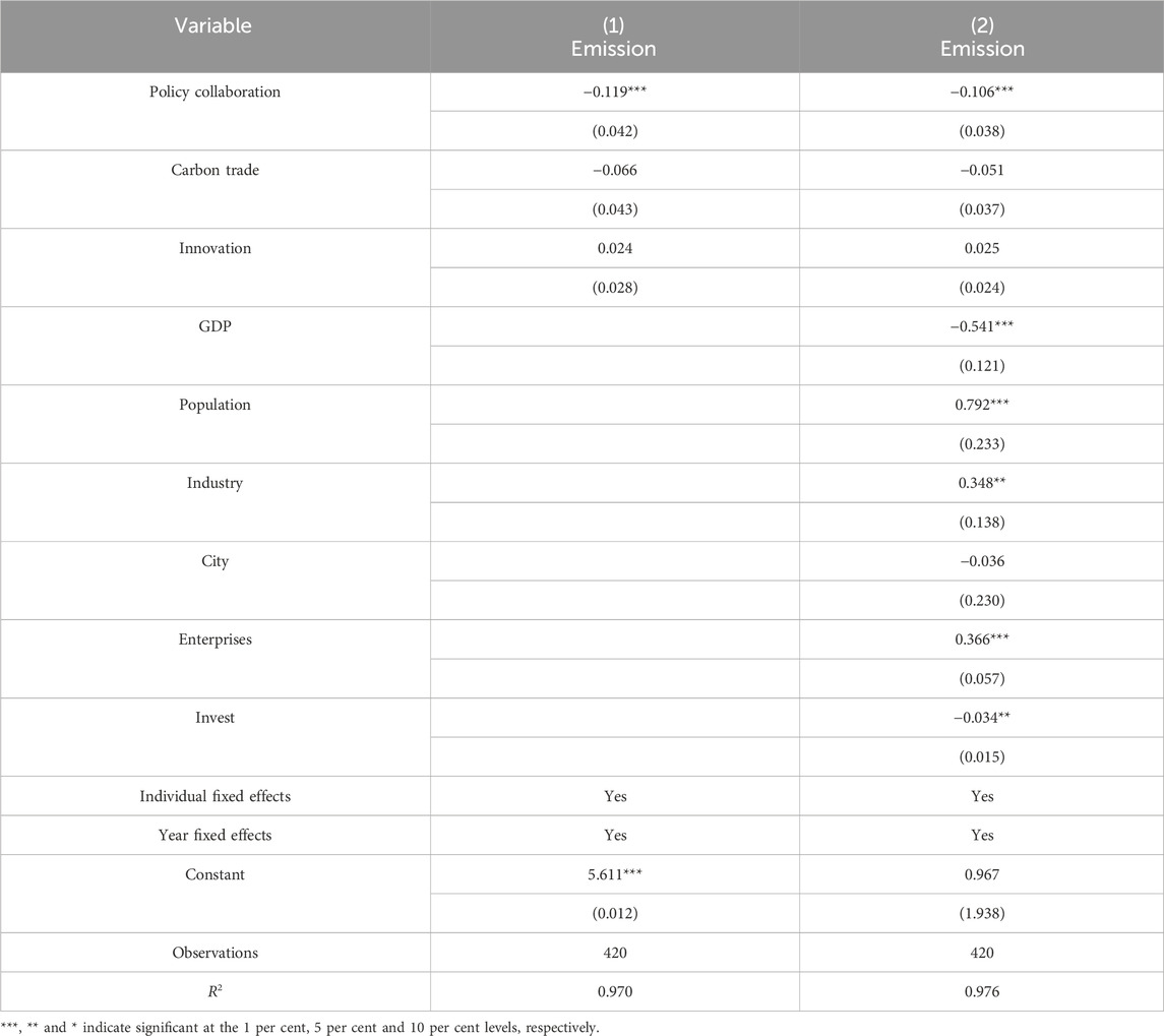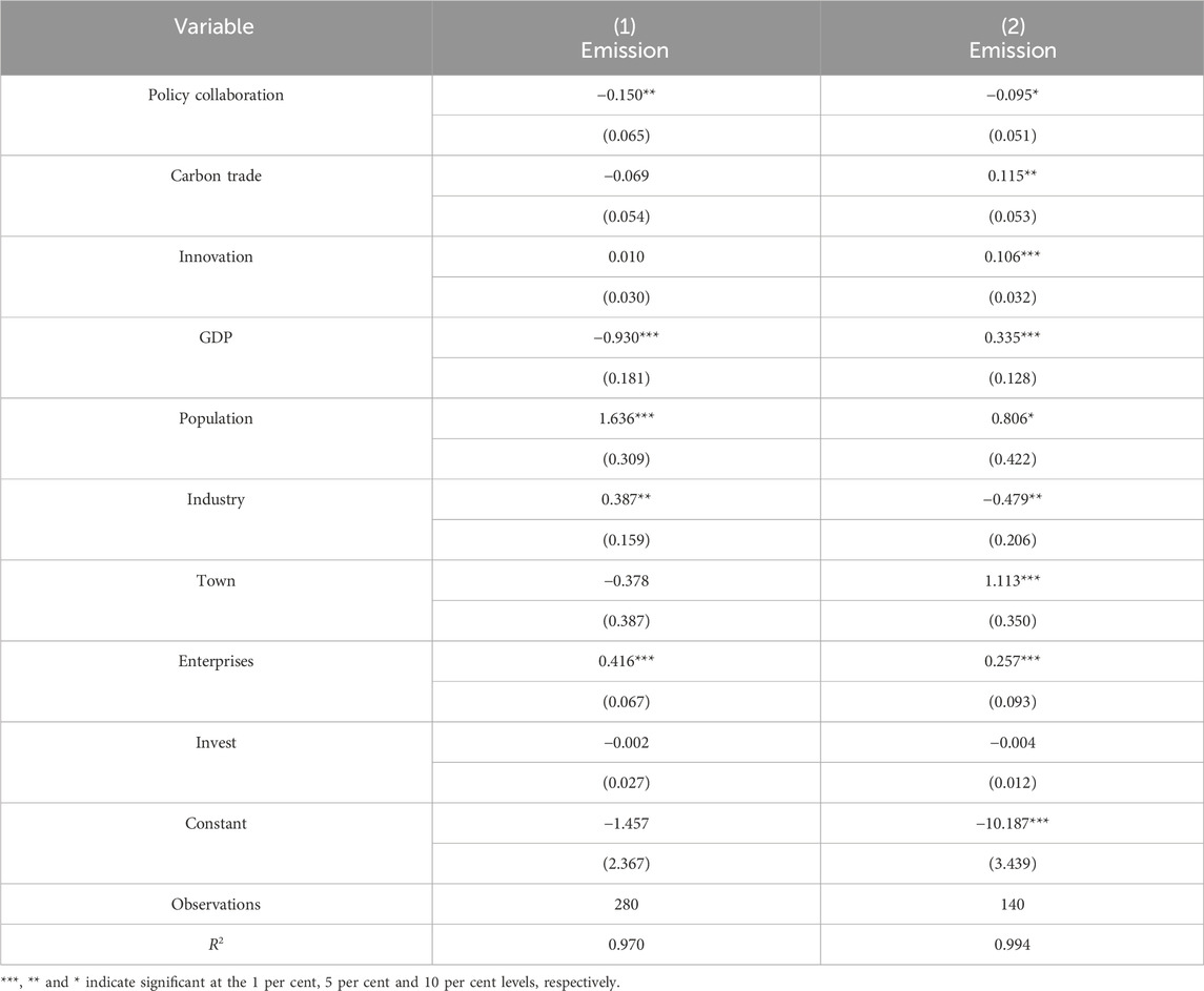 Table 4 reports the regression results of model (2), i.e., the impact of the synergy between carbon emissions trading policy and STI policy on the level of carbon emissions. Policy collaboration in columns (1) and (2) is the core coefficient of interest, indicating that there is a strong controlling effect on carbon emissions when two policies simultaneously implemented. After controlling for economic, demographic, and other differences, each unit of enhanced policy collaboration reduces carbon emissions by