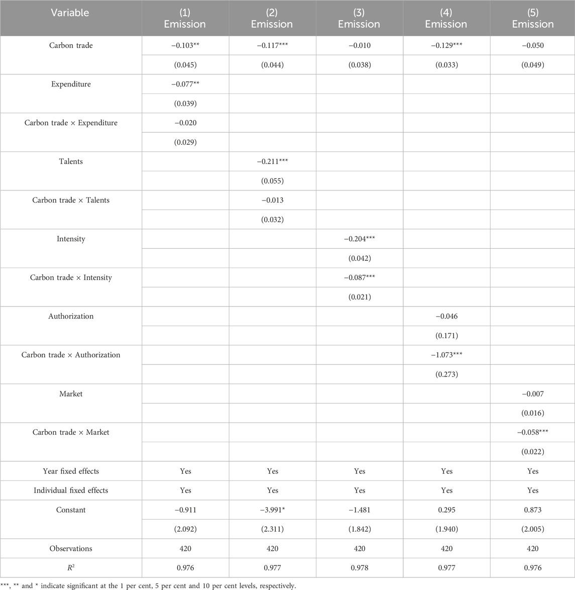 Table 6 shows the regression results of model (3), which reports the impact of the interaction between STI and carbon trading pilot policy on carbon emissions after introducing the moderating terms of the indicators related to STI activities at different stages, i.e., the coefficients of the interaction terms that are the focus. It can be found that the interaction of government financial expenditure on science and technology, enterprise human resource input and policy respectively at different stages of STI activities does not significantly affect carbon emissions, while the interaction of three STI activities, namely, enterprise funding intensity, actual patent grant rate and technology marketization, with policy all positively control carbon emissions at the 1% level.