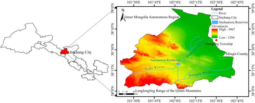 Jinchang City is located in the northwestern part of Gansu Province. It is a key node on the ancient Silk Road and an important city in the eastern Hexi Corridor. As shown in Figure 1, it is situated on the northern slope of the Qilian Mountains and the southern edge of the Alxa Plateau, between 37°47′10″N-39°00′30″N and 101°04′35″E−102°43′40″E. The city features a unique geographical layout, bordered by distinct administrative regions. To the northeast, it borders Minqin County; to the southwest, it adjoins Menyuan Hui Autonomous County of Qinghai Province; to the northwest, it borders the Inner Mongolia Autonomous Region (Chang et al., 2023). The city stretches about 145 km from east to west and about 135 km from north to south, with a total boundary length of 486 km. It is one of the 110 most water stressed cities in China, with per capita water resources only 1,173 m3, far lower than that of provincial and national average. The city has a typical temperate continental climate with dryness all year round and little precipitation, leading to especially harsh natural environmental conditions. Surface water and groundwater resources in Jinchang mainly come from natural precipitation, glacier melting water and snow melting water in the southern Qilian Mountains, forming surface runoff and recharging groundwater through infiltration. The main rivers in the study area, including the Jinchuan River, Dongda River and Xida River, all originate from the Lenglongling Range of the Qilian Mountains, and they belong to the Shiyang River watershed system.