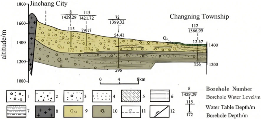 The basic hydrogeology of the study area is used for groundwater zoning. To the east of the study area is the Minqin Basin, the Longshou Mountains form the western and southern boundary, and to the north is the Chaoshuidong Basin. The groundwater system mainly consists of Quaternary unconsolidated porous aquifers with local recharge to karst-fracture water. The Changning Basin is located in the western downstream part of the Shiyang River Basin, and is part of the Xida River terminal area (Jiang et al., 2018). The basin is surrounded by the Longshou Mountain range in the south, north and west, and connects to the Minqin Basin in the east. The Quaternary deposits in the basin vary in thickness from 80 to 300 m, gradually thinning from west to east. As shown in Figure 2, lithologically, the western part (from Jinchang City to Xiafen region) is mainly gravel-pebble and sandy gravel formation, and most other parts are interbedded layers of sandy gravel, sand, and clay. Well yield ranges from 1,000 to 5,000 m3/day, and the total dissolved solids are generally 0.49–2.64 g/L (localities >5 g/L). Monitoring data from the Changshengtoujingzi observation wells in the northeast of the basin show that the groundwater level has fallen by 14.72 m over the last 2 decades, which is equivalent to an average annual reduction of 0.51 m. The groundwater system is mainly recharged by the mountain-front lateral inflow and the river channel infiltration. The flow pattern is similar to the Minqin Basin, converging radially from the periphery to the center of the basin. Evaporation and human extraction are the main discharge in this area (Liu et al., 2001).