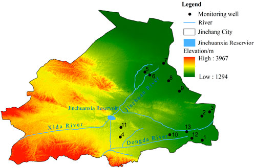 This study collected 1,092 groundwater depth data from 13 national-level monitoring sites in Jinchang City covering monthly observations from 2017 to 2023, and hydrochemical data of each well in September 2023, the distribution map of groundwater monitoring wells is shown in Figure 3 below. Follow strictly the Technical Specifications for Groundwater Environmental Monitoring (HJ 164–2020) for sampling, storage and transportation. The main testing indicators of hydrochemistry are pH value, total hardness, TDS, Ca2+, Mg2+, K+, Na+, Fe3+, Mn2+, Cl−, SO42-, HCO3−, NO3− content, etc. The pH value is measured in situ, and the other testing indicators are finished by the Testing Center of Key Laboratory of Groundwater Engineering and Geothermal Resources in Gansu Province.