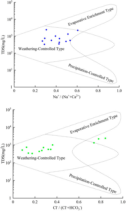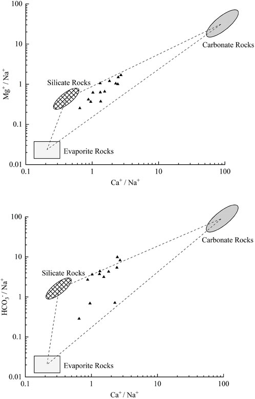 The different combinations of parent rock types (such as carbonates, silicates, and evaporites) in river catchments result in variations in the cation and anion compositions among different rivers (Chen et al., 2002). For instance, Ca2+ and Mg2+ originate from the weathering or dissolution of carbonates, silicates, and evaporites; Na+ and K+ come from evaporites or the weathering of silicates; HCO3− is derived from carbonates and silicates. Ca2+/Na+, Mg2+/Na+, and HCO3−/Na+ are not affected by flow rate, dilution and evaporation, and their relationship can reveal the hydrochemical origin, that is, the dissolution of which minerals the main ions come from (Thomas et al., 2015). As shown in Figure 6, most sampling points cluster between the silicate and carbonate rock fields, with a larger number in the silicate field, indicating that silicate weathering has the dominant effect on groundwater chemistry, followed by carbonate dissolution. All sampling points are located far away from the evaporite weathering field, suggesting negligible evaporite dissolution contribution to groundwater solutes in the study area.