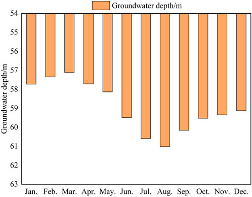 The groundwater level in Jinchang City fluctuates greatly within a year, mainly controlled by the East Asian continental climate pattern, which leads to concentrated and abundant precipitation in the flood season, scarce and unstable rainfall in spring, and extremely low snowfall in winter. Taking the 2022 monthly variation of groundwater depth as an example (Figure 8), three hydrological stages can be identified: the January-March period has the least precipitation but the lowest agricultural extraction, resulting in the recovery of groundwater, and the minimum groundwater depth usually appears in February or March; the April-August period has obvious groundwater depletion due to intensive irrigation pumping and over-exploitation, and the maximum groundwater depth is usually observed in July or August; the September-October period has significant groundwater recharge caused by abundant monsoon rainfall, and the water level gradually recovers; the November-December period has relatively stable groundwater level because the agricultural water consumption decreases significantly.