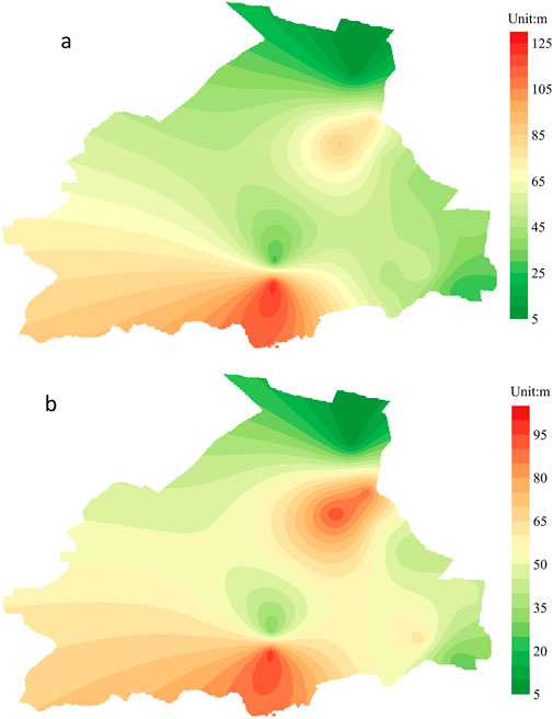 Comparative analysis of the 2017 and 2023 groundwater depth contour maps (Figure 10) reveals that the most pronounced increases in groundwater depth occurred predominantly in central Jinchang areas characterized by intensive human activities and substantial groundwater extraction, clearly demonstrating the dominant anthropogenic influence on groundwater level variations in the region.