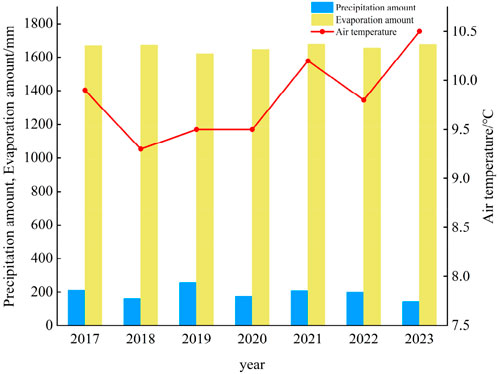 Figure 11. Variations in precipitation, evapotranspiration and air temperature in Jinchang City from 2017 to 2023.