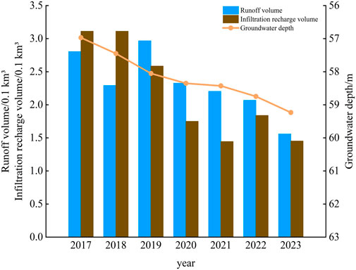 Figure 12. Comparative analysis of runoff, surface water infiltration recharge, and groundwater depth in Jinchang City from 2017 to 2023.