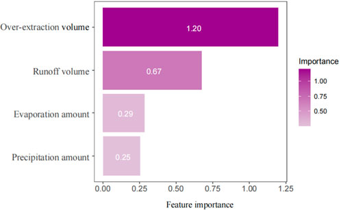 The “randomForest” package in the R software was used to build a random forest model in this study, The random forest model was trained on a panel dataset constructed from the 13 monitoring wells over the 84-month period (2017–2023). This resulted in a total of 1,092 theoretical data points (13 wells × 84 months). For each well and each month, the target variable was the groundwater depth, and the predictor variables included the corresponding monthly values (or annual aggregates where applicable) of groundwater extraction, surface runoff, precipitation, and evaporation. This structure allowed the model to learn from both the spatial variability across the wells and the temporal dynamics over the 7-year study period. The hyperparameter tuning was applied to obtain the feature importance scores of over-extraction, runoff, evaporation, and precipitation factors on the variation of the groundwater depth in Jinchang City from 2017 to 2023. The results show that groundwater over-extraction had the greatest impact on the groundwater table decline during the study period, with a feature importance index of 1.2, followed by runoff (index of 0.67), as shown in Figure 14. Despite the large interannual variability in precipitation and evaporation, their overall stable temporal trends led to minor effects on the changes in groundwater level.