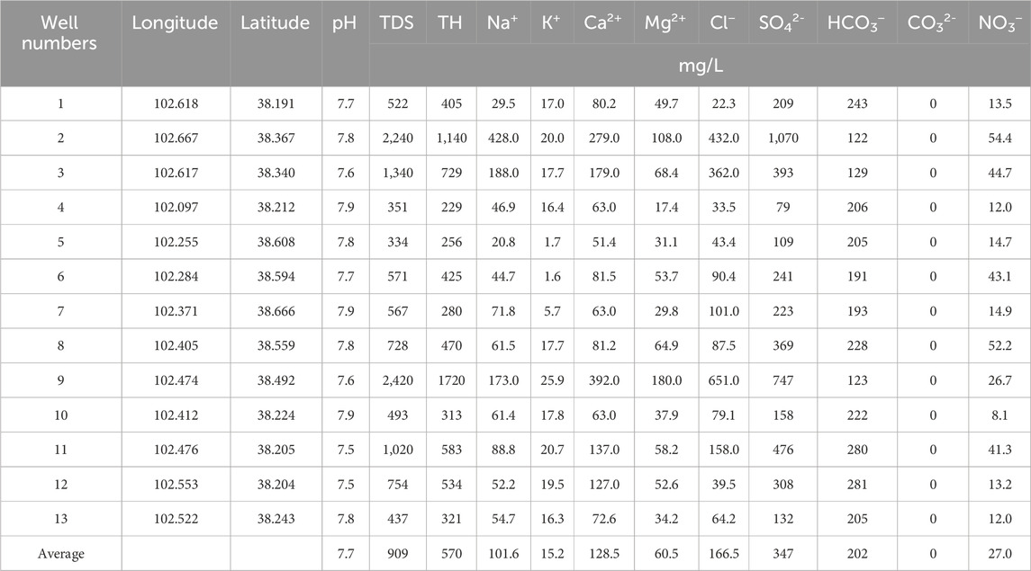 The statistical results of hydrochemical characteristics of groundwater in Jinchang City are shown in Table 1. The pH of groundwater in Jinchang City ranged from 7.50 to 7.90, with an average value of 7.73, indicating slightly alkaline conditions. The total hardness (TH) of groundwater ranged from 229 to 1720 mg/L, with a mean value of 569.62 mg/L. The proportion of samples classified as hard water (150 mg/L < TH < 450 mg/L) and very hard water (TH > 450 mg/L) was 54% and 46%, respectively (i.e., 7 out of 13 samples belonged to hard water and 6 out of 13 samples belonged to very hard water). Respectively. The total dissolved solids (TDS) of groundwater ranged from 334 to 2,420 mg/L, with a mean value of 905.92 mg/L. The proportion of fresh water (TDS <1,000 mg/L) and brackish water (1,000 mg/L < TDS <3,000 mg/L) was 69% and 31%, respectively (i.e., 9 out of 13 samples belonged to fresh water and 4 out of 13 samples belonged to brackish water). The main cations followed the order Ca2+ > Na+ > Mg2+ > K+, and the main anions followed the order SO42- > HCO3− > Cl− > NO3−. The predominant anion and cation were SO42- and Ca2+, respectively. It is worth noting that the average concentrations of SO42-, NO3− and TH exceeded Class III standards of the “Quality Standard for Groundwater” (GB/T 14,848–2017) and the “Standards for Drinking Water Quality” (GB 5749–2022). This suggests that the quality of groundwater in Jinchang City may have been affected by human activities.