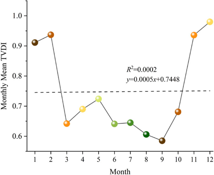 Based on the monthly TVDI variation trend in Baoshan City, as shown in Figures 7–9, autocorrelation tests and regression with precipitation data were conducted. The time series exhibited no significant autocorrelation at lag periods of 1, 2, and 3 months, but demonstrated a significant correlation with precipitation, with a goodness-of-fit coefficient of R2 = 0.887 (p < 0.05). The intra-annual drought process displayed a pronounced “high in winter and spring, low in summer and autumn” seasonal fluctuation pattern (Chen et al., 2024).