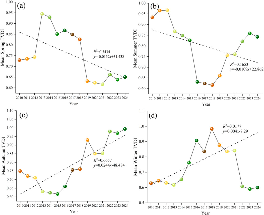 Figure 10. Interannual variations of TVDI across seasons. (a) Spring. (b) Summer. (c) Autumn. (d) Winter.