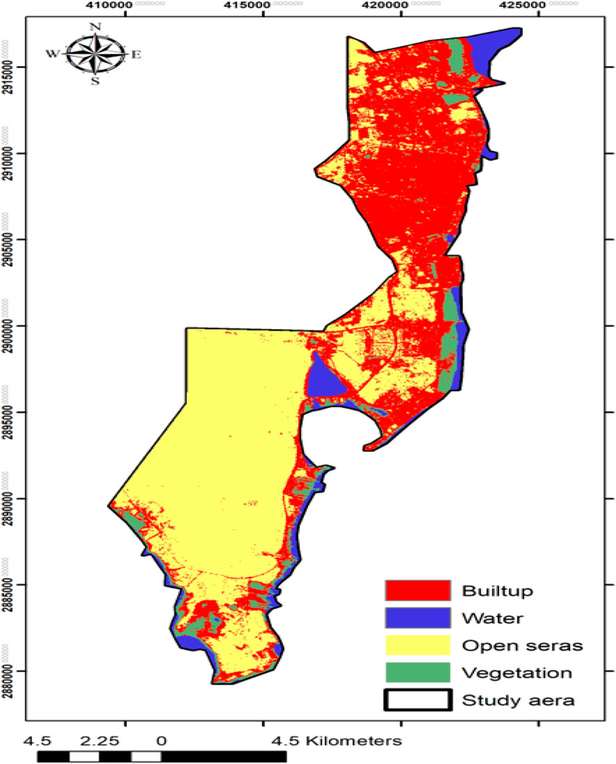 Four land cover classes were identified within the study area through visual interpretation of the satellite imagery, aided by an existing reference land cover map. The classes were: urban areas (built-up, residential areas and road networks), water (water bodies), open areas (bare lands), and vegetation areas (agriculture lands and gardens) as represent in Table 3 and Figure 4. For each class, representative training sites (polygons) were digitized. Pixels within these polygons were selected as training data. The key criteria for selecting training sites were uniformity (spectral homogeneity within the polygon) and representativeness (the ability to capture the spectral variability of the class across the entire image) (Campbell and Wynne, 2011).