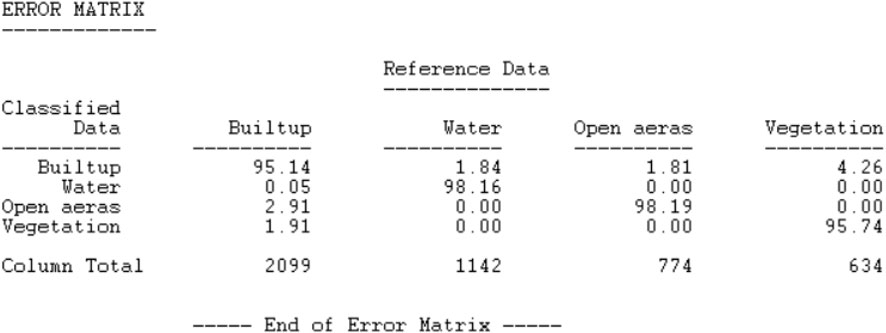 The 1999 land use/land cover (LULC) map of Al-Khobar city was successfully generated through MLC algorithm of Landsat-5 (TM) imagery, utilizing 250 representative training samples per class that demonstrated excellent separability (>93% accuracy) with minimal inter-class confusion (<7%) as confirmed by contingency matrix analysis (Figure 3), following established remote sensing protocols (Albalawi, 2020). The classification output (Figure 4) accurately delineated four distinct LULC categories, with validation results confirming the robustness of both the training data selection and classification methodology, consistent with best practices in supervised classification of urban environments (Jozdani et al., 2019). This high classification accuracy (>93%) provides a reliable baseline for subsequent change detection analysis, particularly important for quantifying urban expansion and its thermal impacts in arid regions (Mertes et al., 2015), while the balanced sampling approach (equal samples per class) and rigorous accuracy assessment ensure statistically sound results comparable to other LULC change studies in similar climatic contexts (Phinzi et al., 2023). The results demonstrated in this classification phase establishes confidence in the derived LULC maps and their utility for detecting LULC changes and associated environmental impacts over the 25-year study period in the study region.