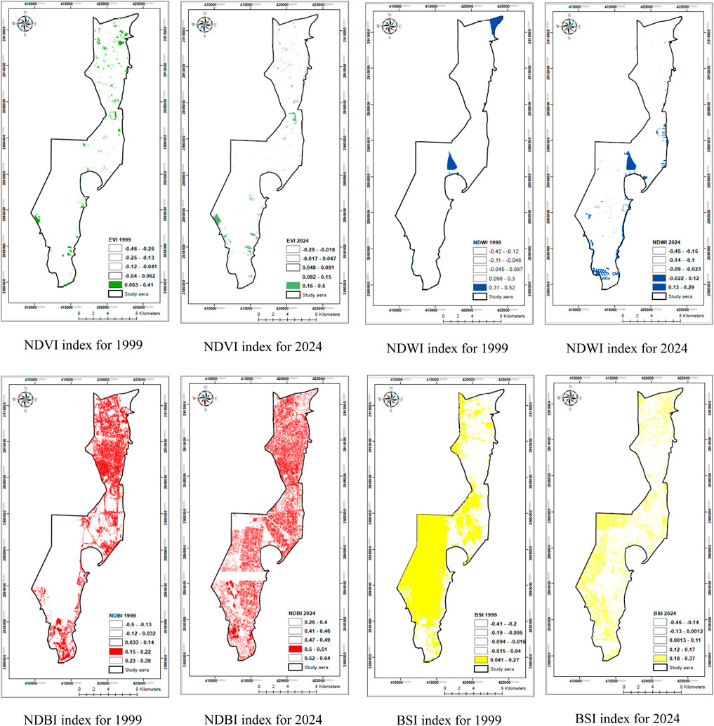 Figure 7. Spectral maps of NDVI, NDBI, NDWI, and BSI indices based on the Landsat-5 (1999) and the Landsat-8 (2024) images.
