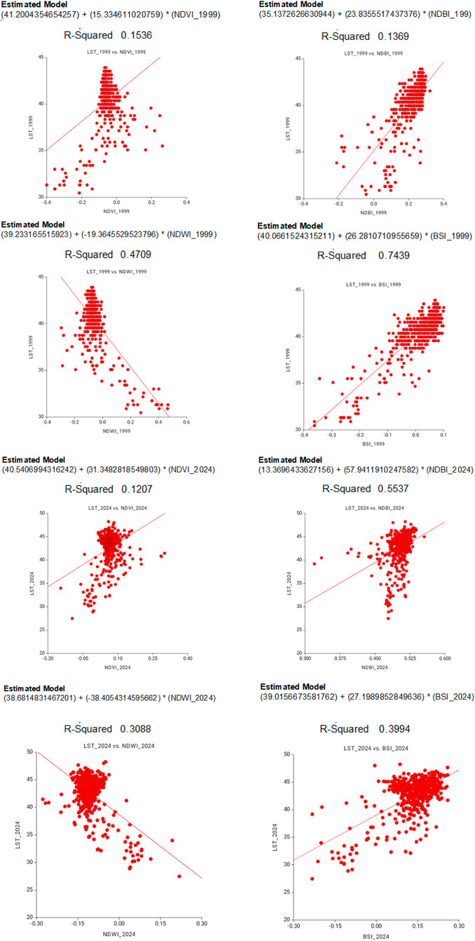 The correlation and regression analysis conducted in NCSS statistical software, which is used for data analysis and statistical evaluation (https://www.ncss.com/software/ncss/) revealed significant relationships between spectral indices and LST, offering insights into the thermal dynamics of Al-Khobar’s arid urban environment (Figure 9). All reported correlations were found to be statistically significant (p < 0.001), indicating a very low probability that these observed relationships occurred by chance. Conversely, the strong and strengthening positive correlation between NDBI and LST (r = 0.1369 and 0.5537) in both 1999 and 2024 unequivocally underscores the role of urbanization as the dominant driver of surface heating. This finding is consistent with observations across the Arabian Peninsula, including studies in Buraydah, Saudi Arabia (Noroozi et al., 2024), and other Gulf cities (Alexander, 2020; Rasul et al., 2018), where the conversion of barren land to built-up area consistently results in significant LST increases. The marked decline in NDWI and its strong negative correlation with LST (r = 0.4709 in 1999 to r = 0.3088 in 2024) further highlights the critical, yet diminishing, role of water bodies as natural coolants. This aligns with concerns raised about the loss of coastal and inland water bodies due to land reclamation in Gulf urban centers suggesting that the conservation of aquatic features is not just an ecological but a thermal imperative for arid cities (Ouma et al., 2021). While vegetation (NDVI) typically shows negative LST correlations in temperate cities (r = 0.1536 in 1999 to r = 0.1207 in 2024) reflect the unique dynamics of irrigated urban greenery in deserts, where limited evapotranspiration and adjacency to heat-retaining surfaces can invert expected thermal relationships. The most striking finding was the consistent positive correlation between NDVI and LST, which contrasts with the typical negative correlation observed in temperate and mesic cities. This anomaly aligns, however, with the growing body of evidence from arid urban studies. For instance, similar weak or positive NDVI-LST relationships have been reported in other desert cities (Ferreira and Duarte, 2019), where irrigated vegetation may exhibit limited evapotranspirative cooling and can be surrounded by heat-retaining impervious surfaces that elevate local ambient temperatures. This suggests that the cooling efficacy of urban greenery in arid regions like Al-Khobar city is highly contingent on its type, density, and spatial configuration, a crucial nuance for planners that is often overlooked in generic UHI mitigation strategies. Finally, the observed BSI-LST correlation over time (0.3994–0.7439) mirrors the 53.7% increasing in barren lands, whose high albedo typically moderates temperatures more effectively than urban materials in arid zones (Rida et al., 2021). Collectively, these index-LST relationships, quantified through NCSS’s robust statistical toolkit, collectively demonstrate how Al-Khobar’s land cover changes have thermally reconfigured its urban environment, with urbanization effects outweighing the cooling potential of limited vegetation gains a pattern increasingly documented in fast-growing Gulf cities (Alexander, 2020). The findings underscore the value of spectral indices as diagnostic tools for urban climate studies while highlighting region-specific exceptions to typical thermal-vegetation relationships that planners must consider in heat mitigation strategies (Gao et al., 2022).
