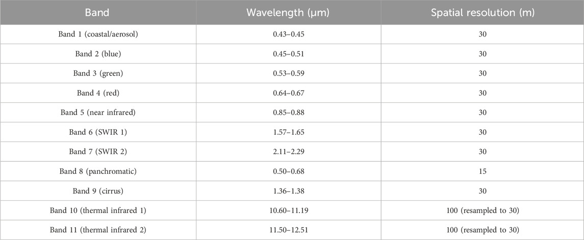 To ensure temporal comparability, anniversary Landsat images were acquired for 1999 (Landsat 5 TM, Path/Row: 165/045, Date: August 7) and 2024 (Landsat 8 OLI/TIRS, Path/Row: 165/045, Date: July 12) from the USGS Earth Explorer portal (https://earthexplorer.usgs.gov/) operated by the U.S. Geological Survey (USGS), as shown in Tables 1, 2. Both scenes were cloud-free over the study area. The images were radiometrically and atmospherically corrected using standard procedures. All reflective and thermal bands were resampled to a consistent 30-m spatial resolution to facilitate multi-temporal analysis and integration.