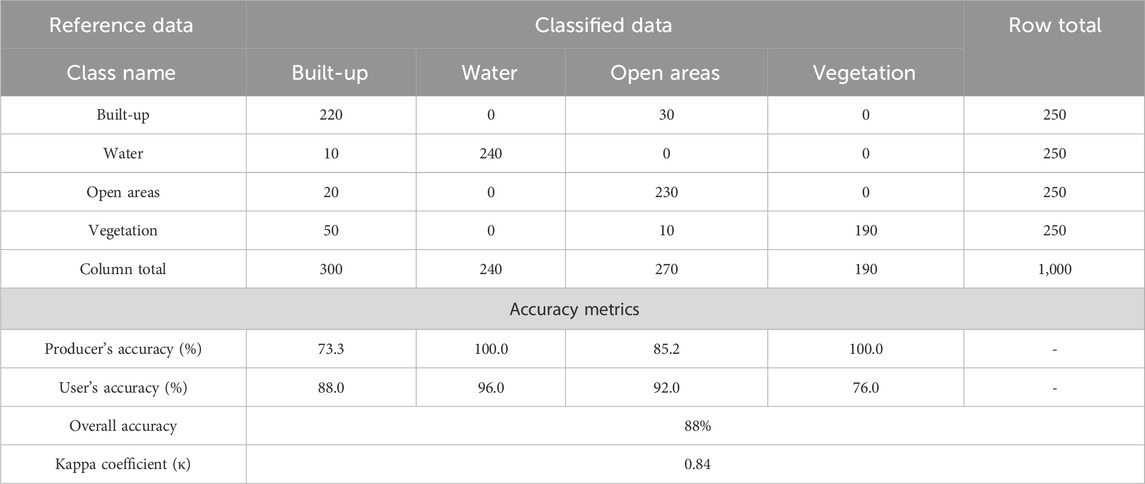 The performance of the MLC classification was rigorously assessed using a stratified random sampling approach to select reference pixels that were strictly independent of the training data. The sample size was determined based on established practices for land cover accuracy assessment, which recommend a minimum of 50–100 samples per land cover class to achieve a stable error matrix and a reliable estimate of overall accuracy (Fathizad et al., 2018; Jensen, 1996). To ensure statistical robustness for our four-class system and to align with common precedents in similar urban remote sensing studies (Pan et al., 2017; Rengma and Yadav, 2024), we selected 250 reference pixels per class, resulting in a total of 1,000 reference pixels for the entire study area. This sample size provides a confidence level of >95% for the estimated accuracies and ensures the Kappa coefficient is derived from a substantial and representative dataset. An error matrix (or confusion matrix) was constructed to compare the classified results against the reference (ground truth) data (Congalton and Green, 2019). From this matrix, four key accuracy metrics were derived as follows: