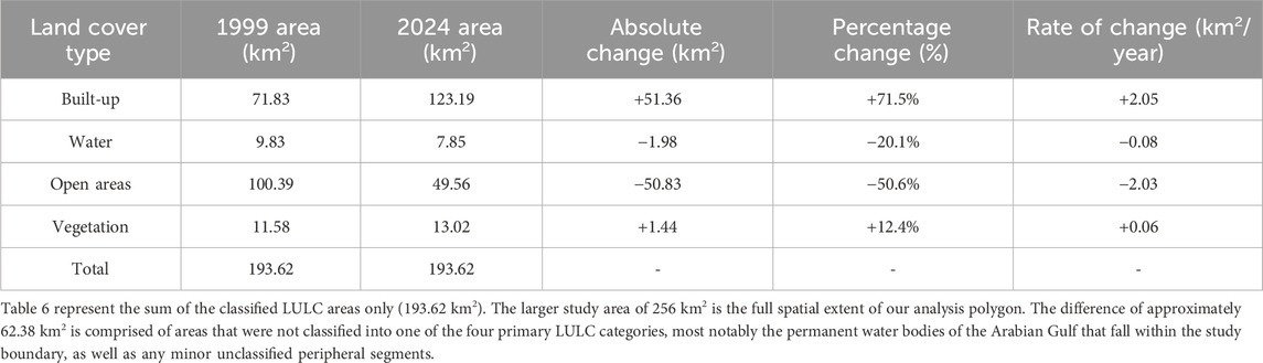 The significant LULC changes in Al-Khobar city between 1999 and 2024 are quantified in Table 6. The most striking transformation is the 71.5% expansion of urban areas (from 71.83 km2 to 123.19 km2), reflecting rapid urbanization trends consistent with GCC cities experiencing economic growth and population influx (Dahy et al., 2024). This urban sprawl, equivalent to a net gain of 51.36 km2 at a rate of 2.05 km2/year, has occurred predominantly at the expense of open lands, which decreased by 50.6% (a net loss of 50.83 km2 at 2.03 km2/year). This patterns observation in other arid urban centers where barren lands are prime targets for conversion (Dahy et al., 2024). The 20.1% reduction in water bodies (a net loss of 1.98 km2) may be attributed to coastal land reclamation practices common in Gulf cities (AlQahtany et al., 2022) and altered hydrological patterns from urban drainage modifications (Subraelu et al., 2022). The observed 12.4% increase in vegetation cover (a net gain of 1.44 km2), while modest in absolute area, indicates a notable shift in the landscape. This change could be attributed to several factors, including increased private irrigation, or agricultural expansion on the city’s periphery, though its limited spatial extent compared to urban growth raises questions about its efficacy in mitigating urban heat island effects a challenge documented in similar desert cities (Pak and Farajzadeh, 2007).