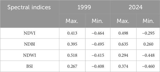 Additionally, the spectral indices NDVI, NDBI, NDWI, and BSI were calculated to map green areas, buildings, water bodies, and bare land based on the Landsat-5 (TM) and Landsat-8 (OLI TIRS) images for 1999 and 2024, respectively. Spectral indices are mathematical equations used to extract information about the dynamics of the Earth’s surface in multispectral satellite imagery by utilizing two or more bands from different portions of the electromagnetic spectrum (Baranwal and Ahmad, 2021). The primary purpose of using these indices is to enhance and extract spectral characteristics of features in the image in order to track temporal changes (Mou et al., 2018). Numerous studies used the NDVI index for mapping and monitoring green areas from satellite imagery (Chen et al., 2015; Fadl et al., 2024; Shah and Siyal, 2019; Sonawane and Bhagat, 2017). Ideally, the values of this index range between −1 and +1, depending on the Digital Numbers (DN) of the Near-Infrared (NIR) and Red bands (Sonawane and Bhagat, 2017). Negative values, correspond to water, while low positive values (0.0–0.2) identify rocks and bare soil, while vegetation has positive values ranging from 0.2 to 1.0 with healthy vegetation has values greater than 0.4. The NDVI index is calculated using the following Equation 9: