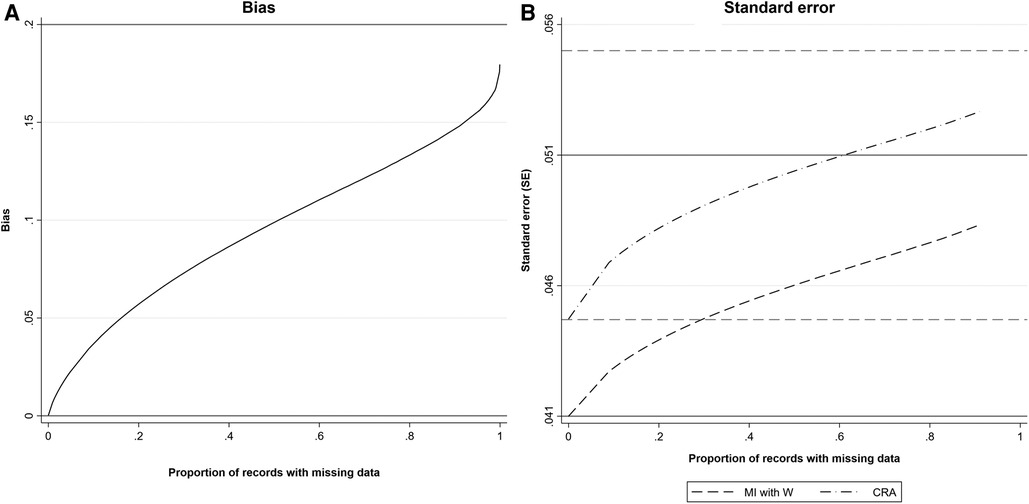 Figure 2. (A) Estimated bias and (B) SE of the MI estimator of βYX when the imputation model includes a collider, W, and SE of the CRA estimator of βYX, plotted against the proportion of records with missing data, when continuous outcome Y is partially observed, assuming 1,000 observed values. All direct effect sizes and error variances equal 1. Horizontal grey solid lines represent the values of bias and SE of the MI estimator when the proportion of records with missing data is 0 (lower line) or tends to 1 (upper line). Horizontal grey dashed lines represent the values of the SE of the CRA estimator when the proportion of records with missing data is 0 (lower line) or tends to 1 (upper line).