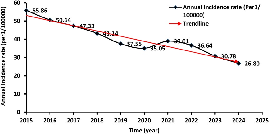 A total of 26,478 TB cases were notified in Libya over the entire study period which lasted for ten years (2015 to 2024). Table 1 shows the number and the annual reported incidence rate. With an average annual reference rate of 40.29/100,000 [95% CI: (40.229 ± 9.01)/100,000]. (trend χ2 = 20.67, P < 0.014). Figure 2 illustrates the TB incidence per 100,000 people during the study period. The incidence showed a downward trend year by year. The highest incidence was reported in 2015 and the lowest one in 2024. There was a 3% annual variation of TB CNR reported from 2015 (55.86/100,000 population) to 2024 (26.80/100,000 population) (p-value for trend p < 0.014). There was overall, case notification rates decreased during this study period (Figure 2).