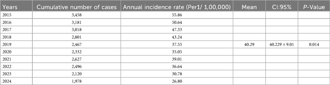 Table 3. Spatial autocorrelation analysis of incidence rate of tuberculosis in Libya from 2015 to 2024.