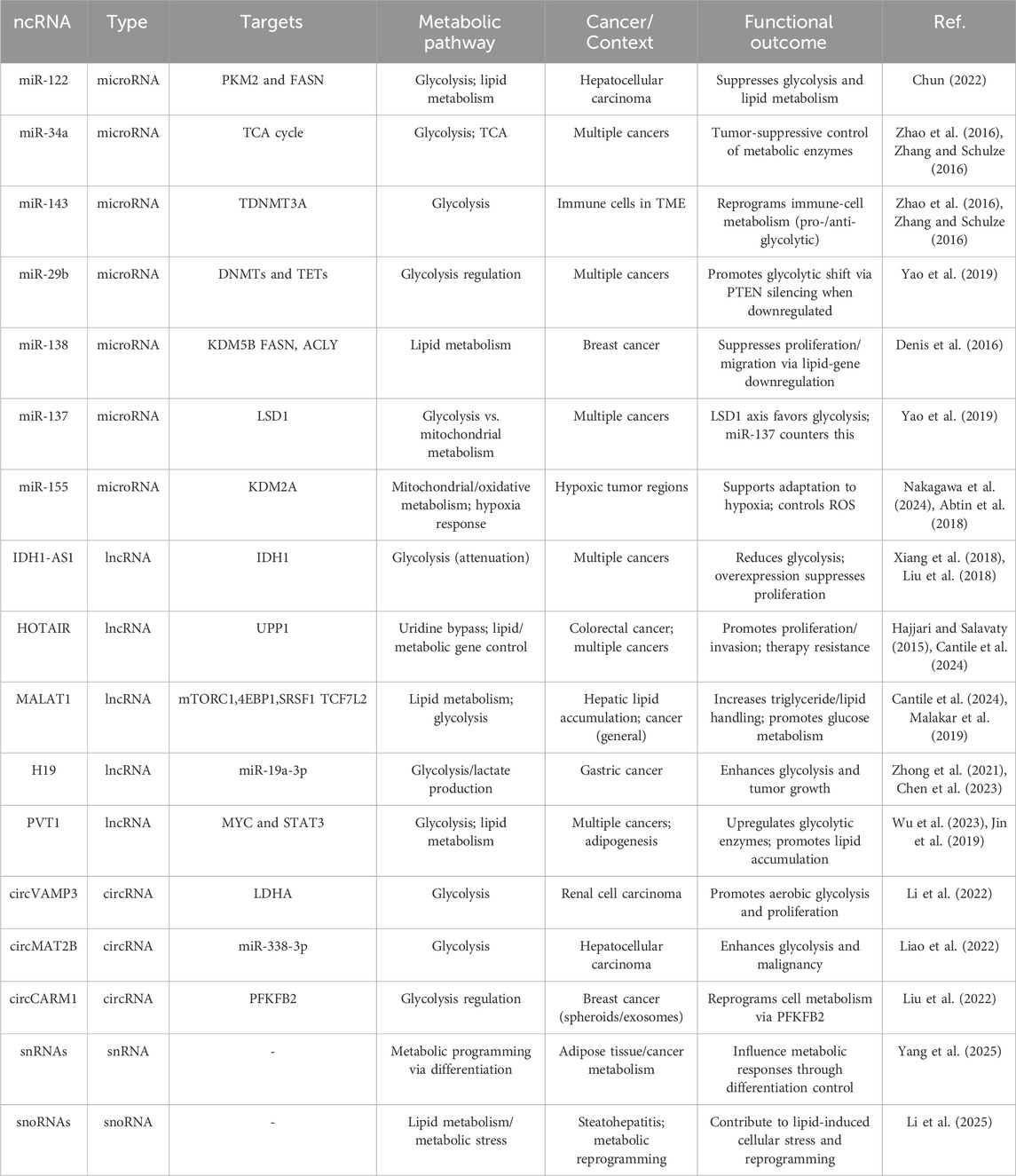 The interplay between ncRNAs, epigenetic remodeling, and metabolic reprogramming defines a multilayered regulatory framework that grants cancer cells remarkable plasticity. MiRNAs, lncRNAs, and circRNAs converge on chromatin modifiers and metabolic enzymes to sustain glycolysis, repress mitochondrial respiration, and diversify lipid and amino acid metabolism. These molecules act within feedback loops integrating nutrient availability, metabolite levels, and chromatin state, allowing tumors to adapt to environmental and therapeutic pressures (Zong et al., 2023; Shin et al., 2025; Wang et al., 2022). For example, both miR-199a and miR-122 reduce the expression of pyruvate kinase M2 (PKM2) and are therefore downregulated under hypoxic conditions, which are common in cancer. This downregulation promotes glycolysis and supports the Warburg effect (Liao et al., 2022). In addition, hypoxia leads to the downregulation of miR-125a, which in turn results in the upregulation of hexokinase 2 (HK2), a key rate-limiting enzyme in the glycolytic pathway (Jin et al., 2017).