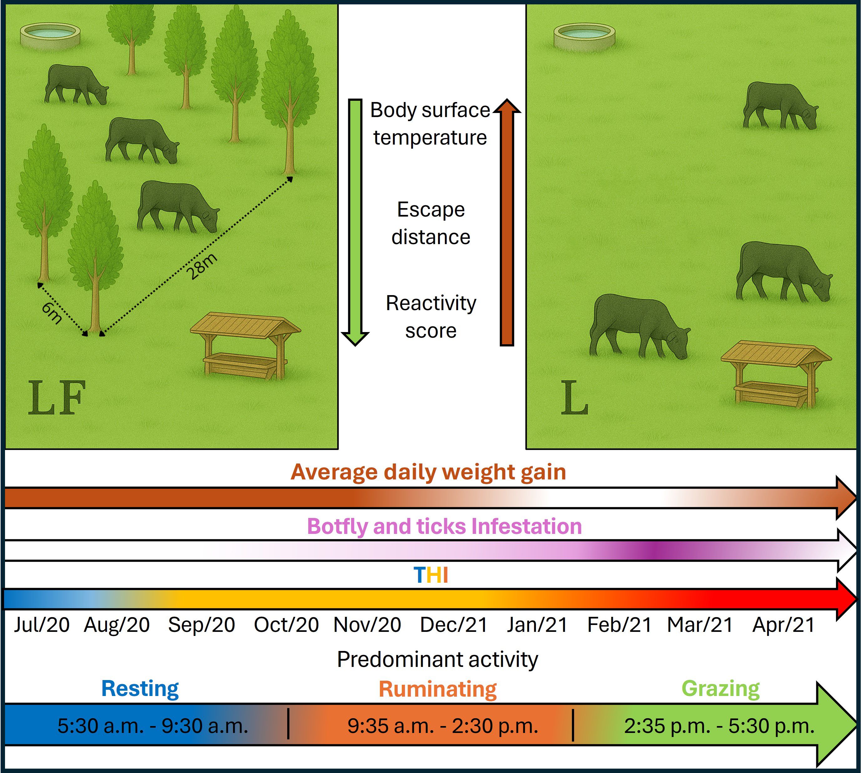 The growing demand for livestock systems that combine sustainability with animal welfare is evident (Nalon et al., 2021). Welfare is a fundamental component of sustainability and plays a crucial role in both productivity and consumer acceptance of animal products (Alonso et al., 2020; Del Campo et al., 2024). In this regard, the silvopastoral system provides numerous advantages: increased biodiversity (Sales-Baptista and Ferraz-de-Oliveira, 2021; Kinneen et al., 2023), improved soil fertility and hydraulic properties (Liu et al., 2024; Romanoski et al., 2025), better management of invasive plant species (Munaro et al., 2023), income diversification (Röhrig et al., 2020), lower thermal stress and improved reproductive performance (Huertas et al., 2021; Lemes et al., 2021), as well as a potential strategy to mitigate greenhouse gas emissions (Portugal et al., 2023). This study contributes new information into the interaction and adaptation of beef cattle to pasture environments with and without tree cover, and the effects on welfare and productivity.
