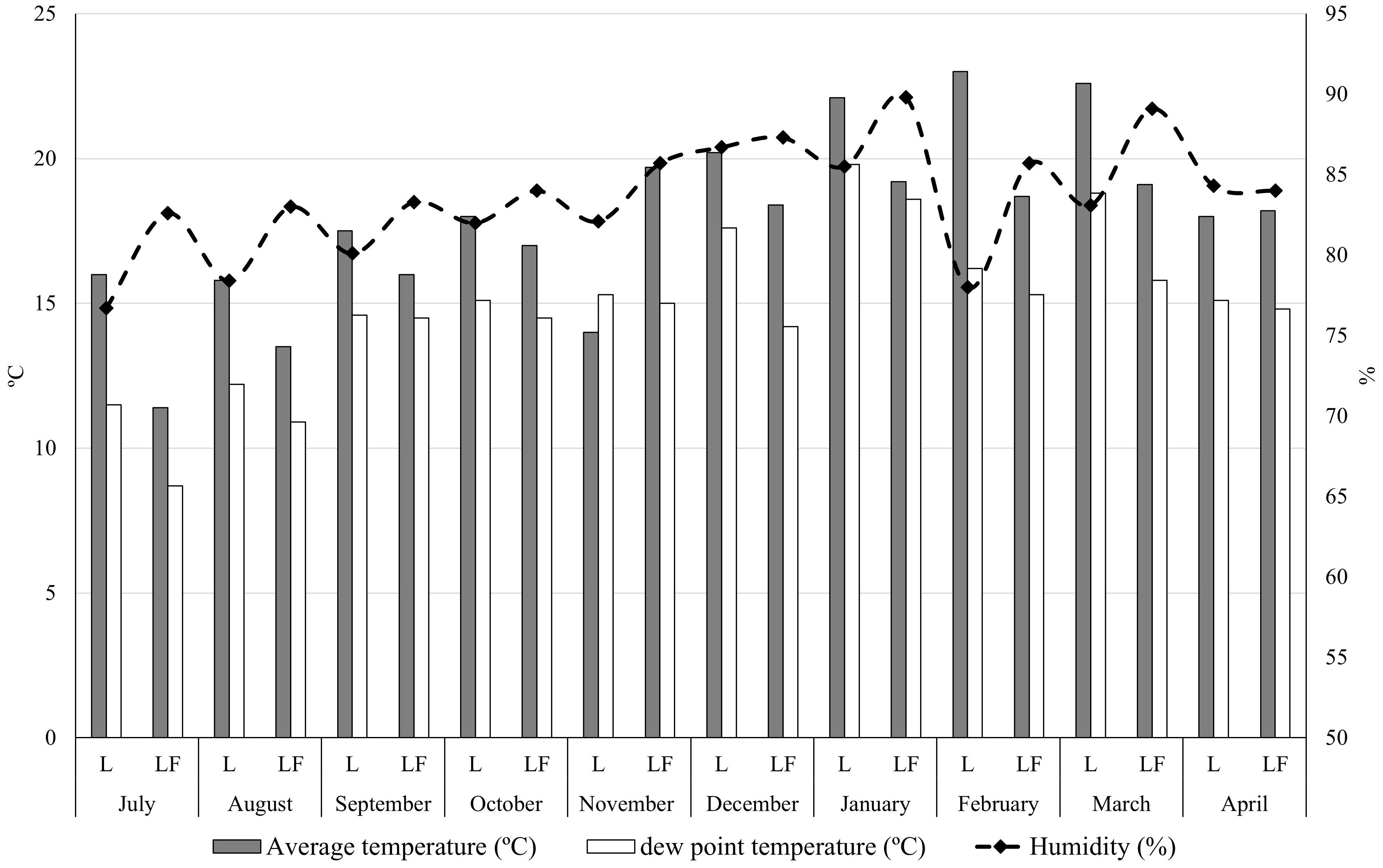 Figure 2. Average temperatures (°C), dew point temperature (°C) and relative humidity (%) in the livestock (L) and livestock-forest (LF) systems in the ten months of evaluation.