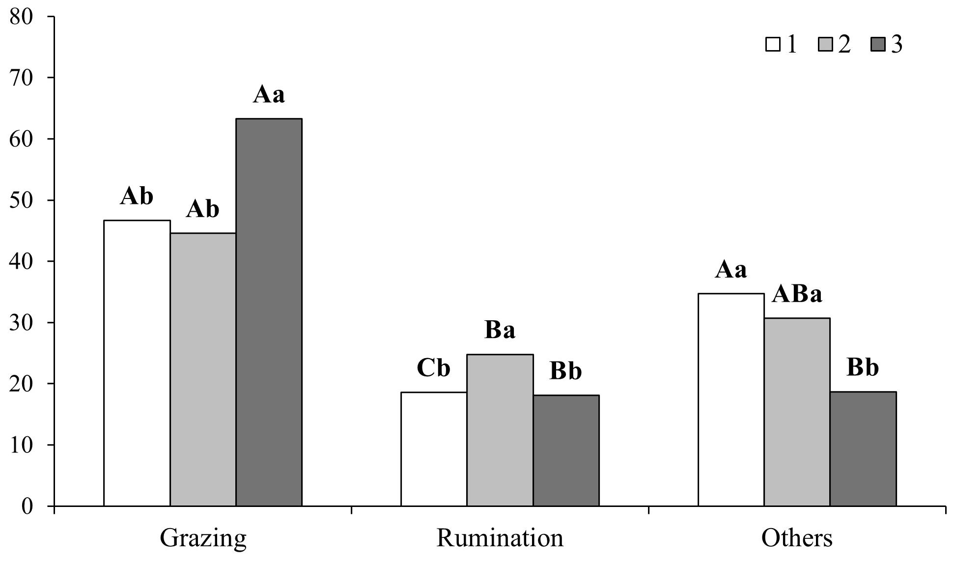 Figure 3. Frequency (%) of grazing, rumination and other activities in the three assessment times 1 (5:30 a.m. - 9:30 a.m.), 2 (9:35 a.m. - 2:30 p.m.) and 3 (2:35 p.m. - 5:30 p.m.), on average across the assessment systems Note: Uppercase letters represent differences between the frequency of activities (grazing, rumination and others) at each assessment time (1, 2 and 3), at a significance level of 5%.