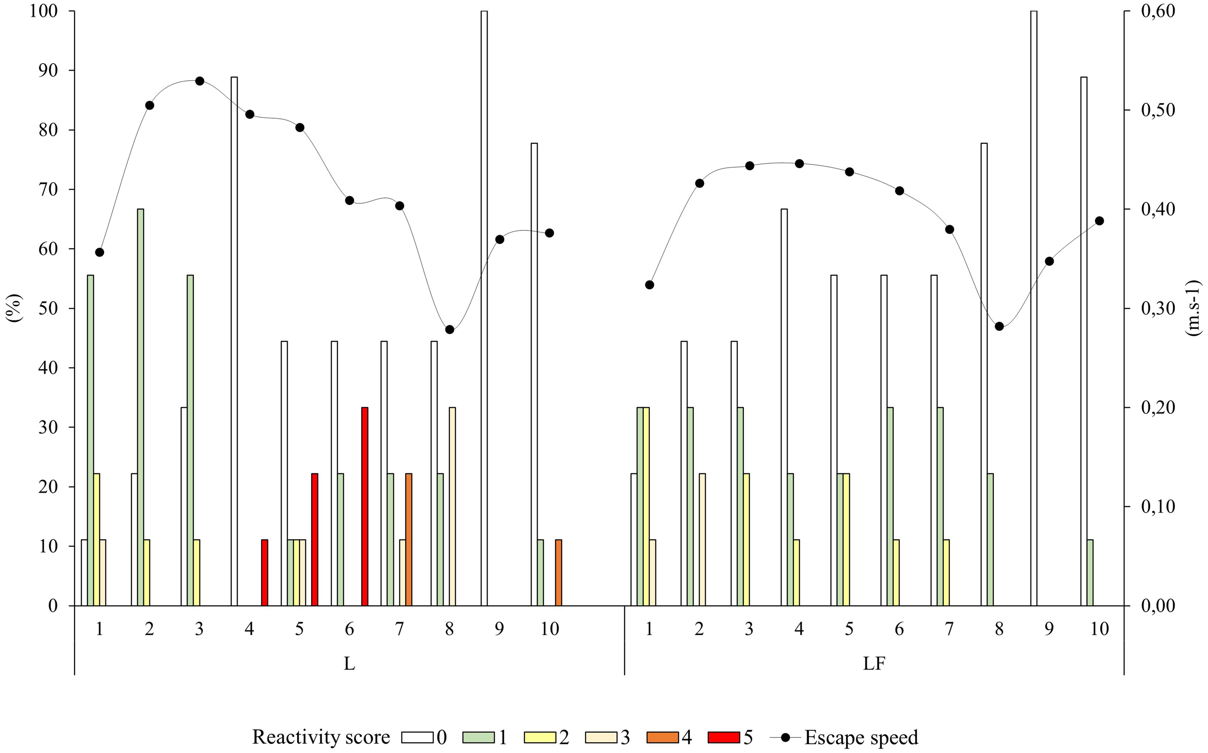Figure 4. Frequency of reactivity scores (1, 2, 3, 4 and 5) and average escape speed values (m s-1) according to the livestock (L) and livestock-forest (LF) systems and the evaluation periods.