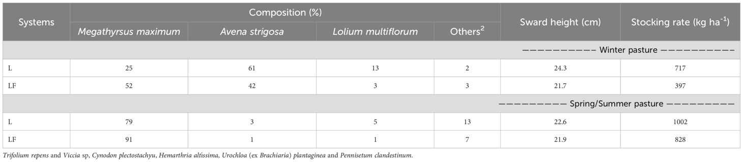 Three crossbred Angus steers (average initial weights of 177 ± 40 kg; 12 months of age) were allocated per paddock, totaling 18 tester animals (nine per system). Pastures were managed under continuous stocking with variable stocking rate (put-and-take method; Mott and Lucas, 1952) to maintain a target sward height of 24 cm. Sward height was monitored every 15 days by measuring 150 points per paddock with a sward stick, and stocking rate was adjusted accordingly. Tester steers remained full-time in the experimental units. Put-and-take animals of similar weight and age were added or removed as needed to regulate sward height and ensure consistent grazing intensity across paddocks. The average sward height and average stocking rates were presented in Table 1.