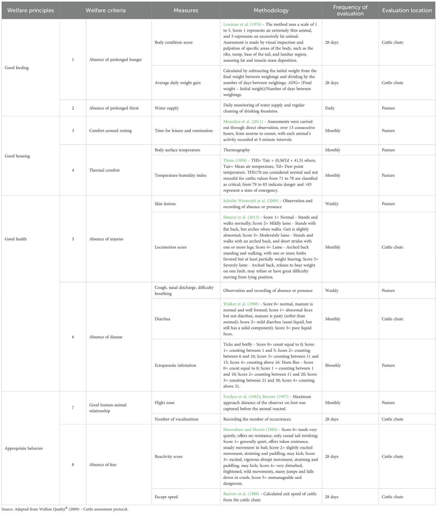 Eight welfare criteria were selected to address the four welfare principles established by the Welfare Quality® protocol (2009 – Table 2). These measures were selected based on the local conditions of extensive cattle production (Huertas et al., 2009), as well as on the feasibility and relevance of the measures as reflections of the welfare promoted by the production system. Table 2 describes the adapted measures used to assess the welfare criteria for cattle grazing and local conditions.