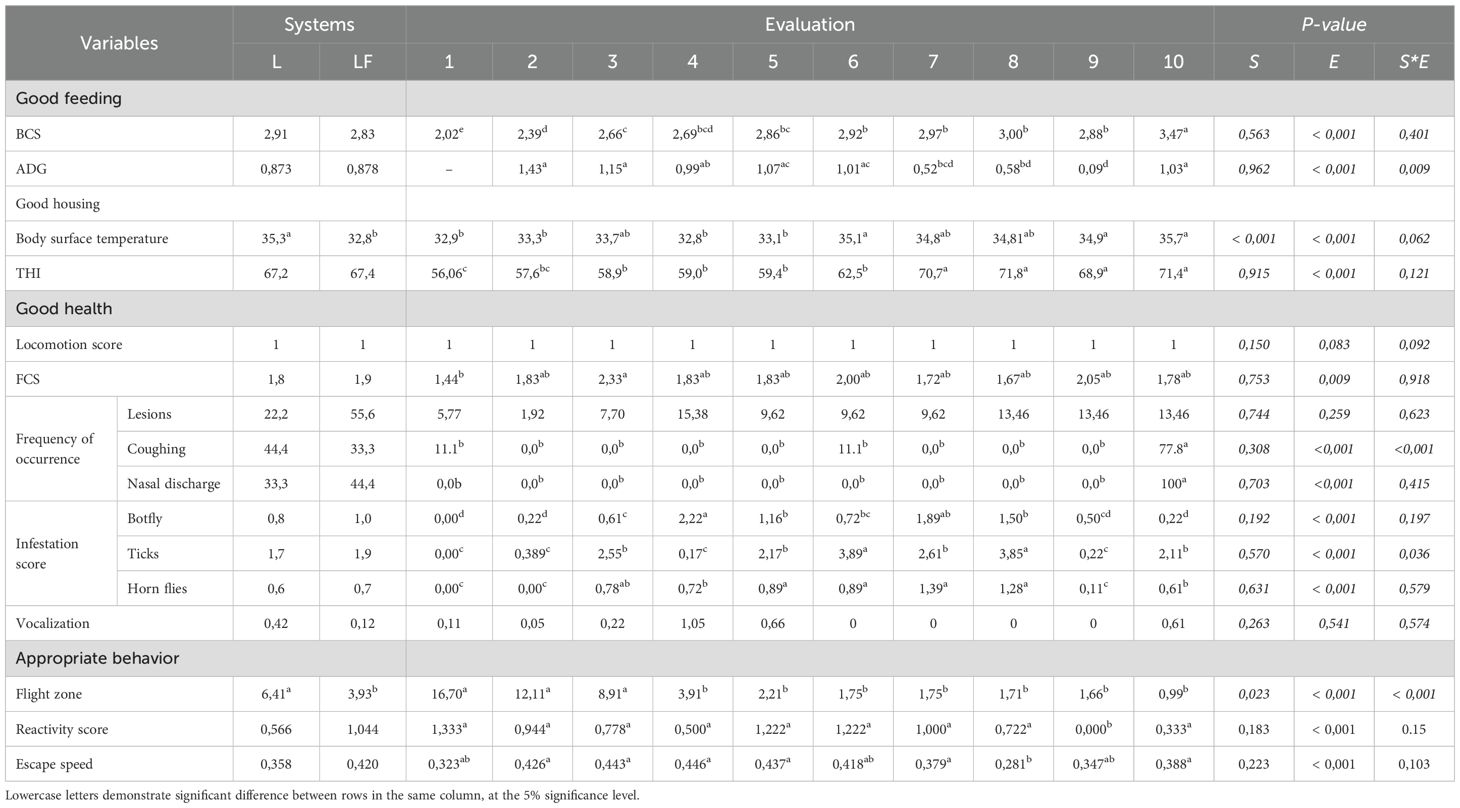 No statistically significant differences were observed between the L and LF systems for LS (p = 0,150), FCS (p = 0,753), or ectoparasite infestation scores for botfly (p = 0,192), ticks (p = 0,570), and horn flies (p = 0,631), regardless of evaluation period (Table 3). The FCS was higher at evaluation 3 and lower at evaluation 1 in both systems (p = 0,009; Table 3). On average, botfly infestation scores were higher at evaluations 4 to 8 (p < 0,001), tick infestation scores were lower at evaluations 1, 2, 4, and 9 (p < 0,001), and horn fly infestation scores were lower at evaluations 1, 2, and 9 (p < 0,001; Table 3).