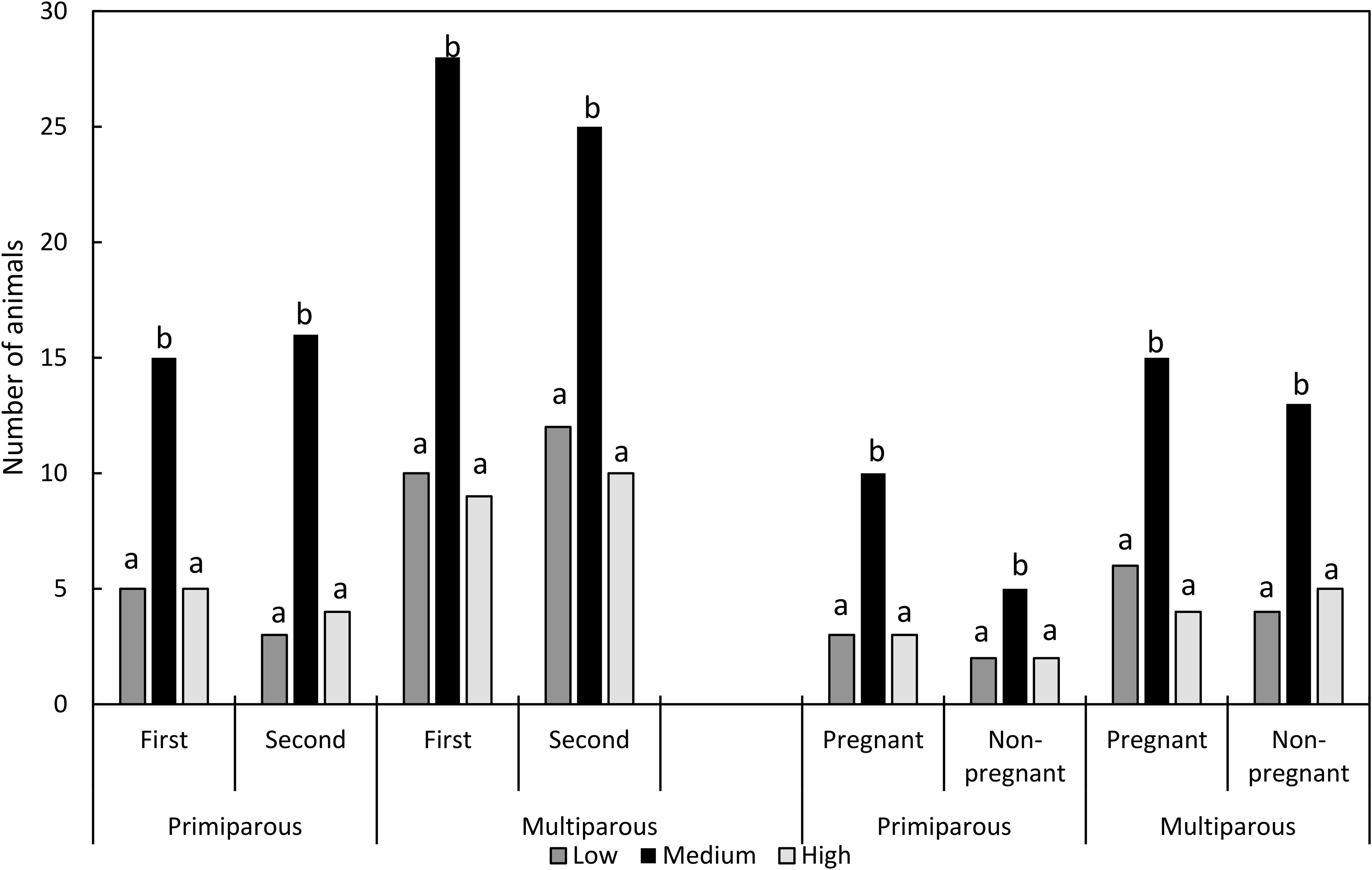 The right side of Figure 1 shows the numbers of pregnant and non-pregnant does at each dominance level according to parity. No differences were found in the proportion of pregnant and non-pregnant does between primiparous and multiparous animals (P > 0.05).
