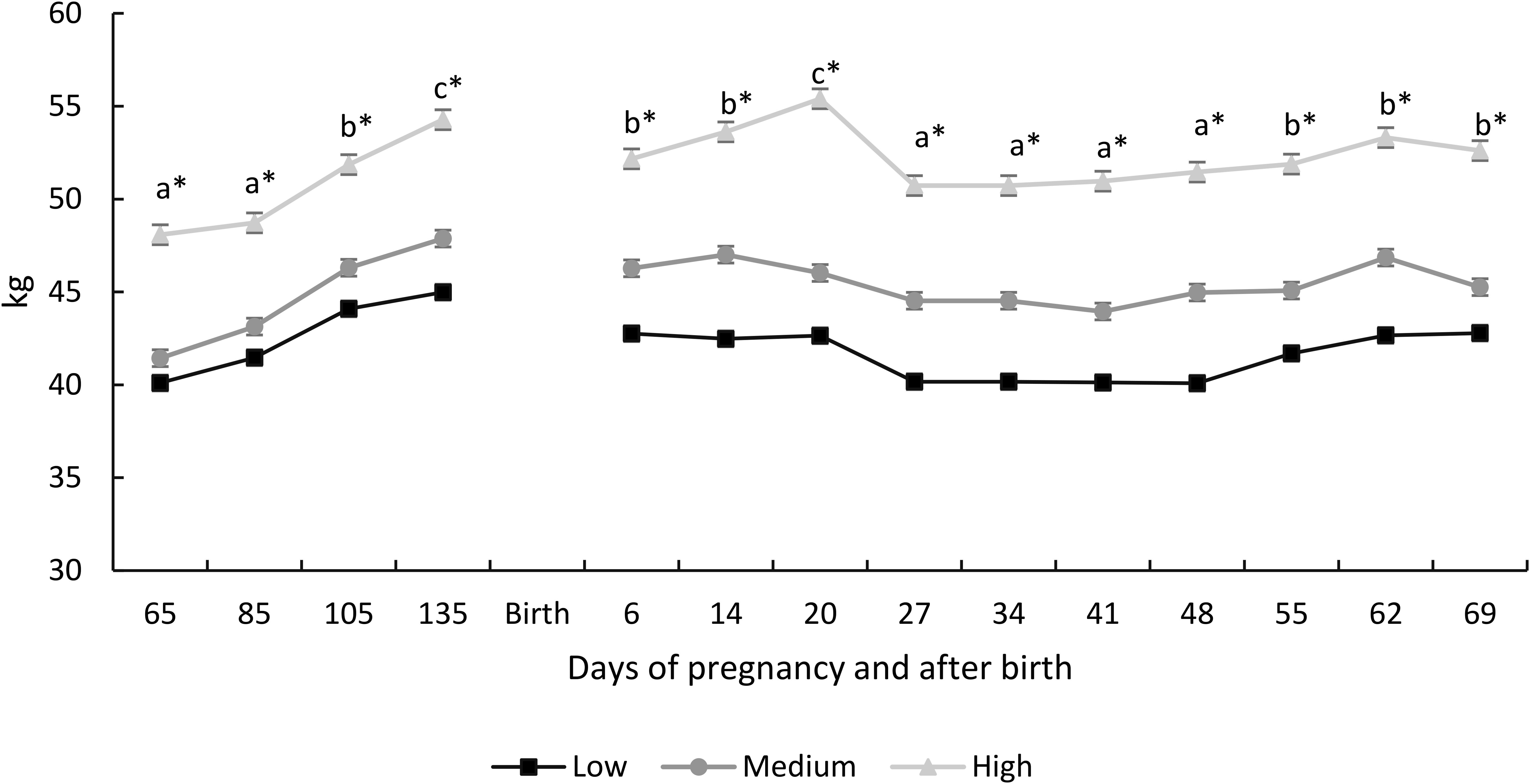 Figure 2. Body weight (mean ± SEM) of goats at the three dominance levels, measured from the second half of gestation until the end of lactation. Different literals indicate significant differences over time (P< 0.0001). Asterisks indicate differences between the three dominance levels (*P< 0.05).