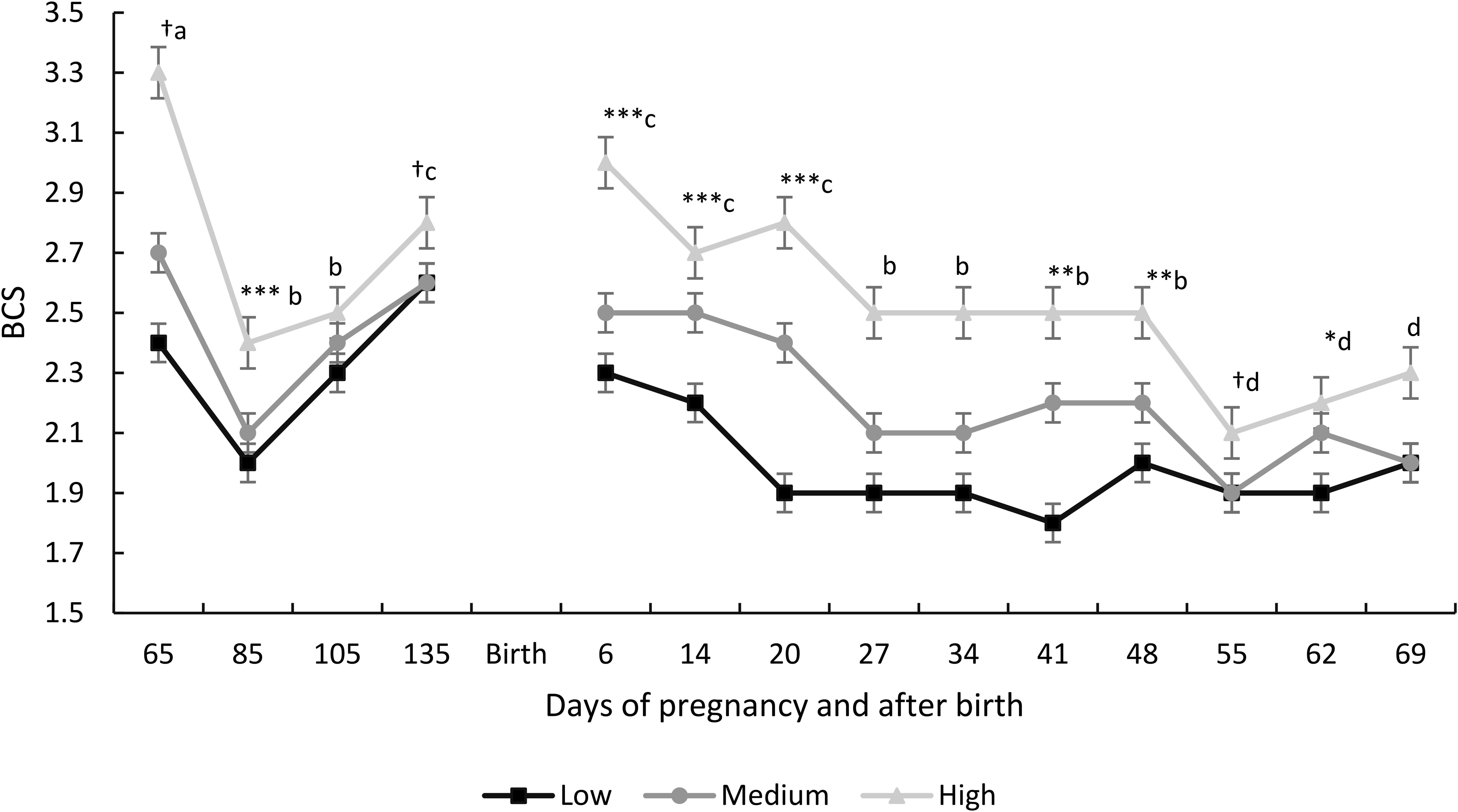 Figure 3. BCS (mean ± SEM) of goats at the three dominance levels, recorded from the second half of gestation until the end of lactation. Differences over time are indicated by different letters (P< 0.05). Differences between dominance levels are indicated by asterisks (*P< 0.05, **P< 0.01, ***P< 0.0001), and trends, by the symbol †.
