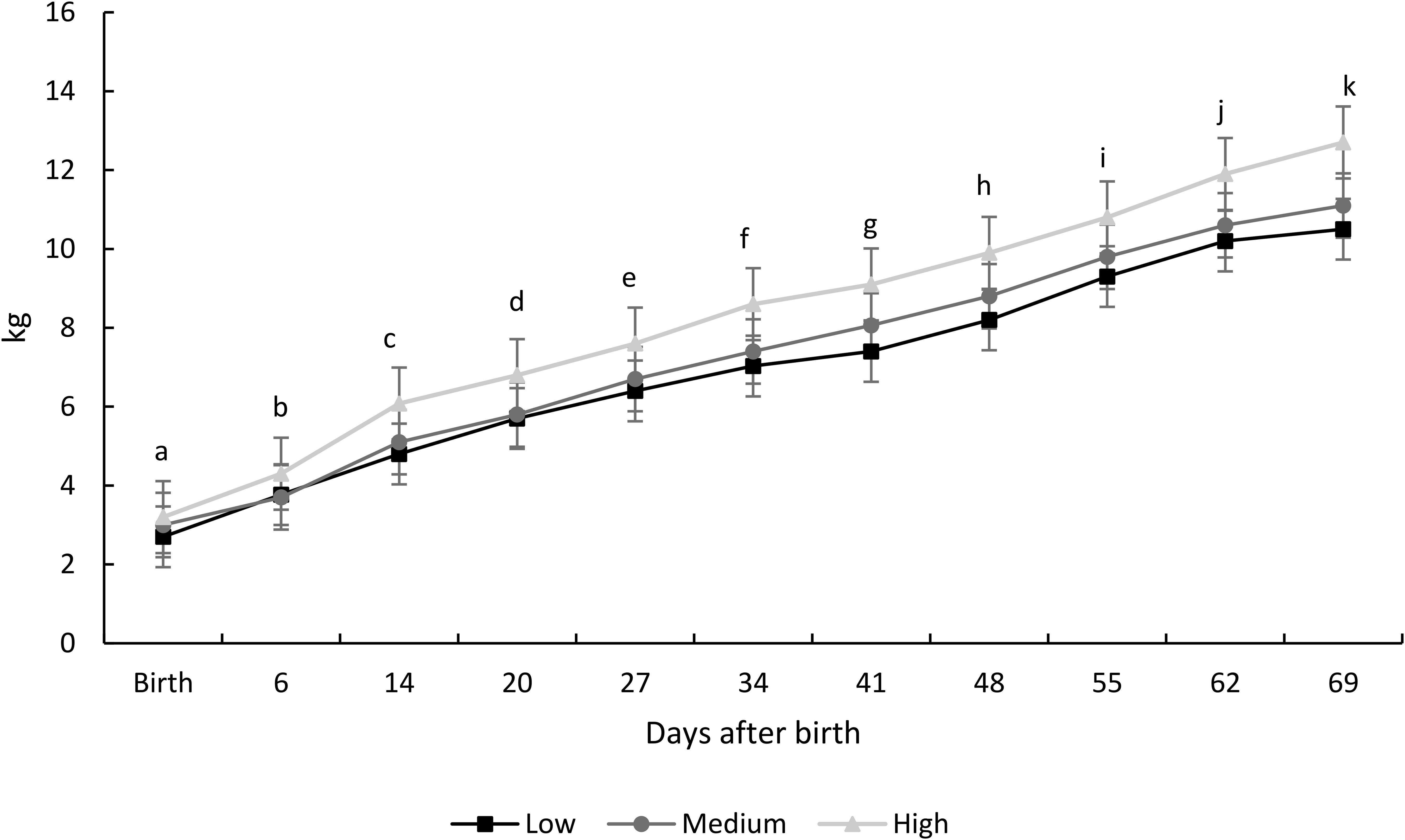 Figure 4. Body weight (mean ± SEM) of kids at the three maternal dominance levels, observed throughout lactation. Different letters indicate differences over time (P< 0.0001).