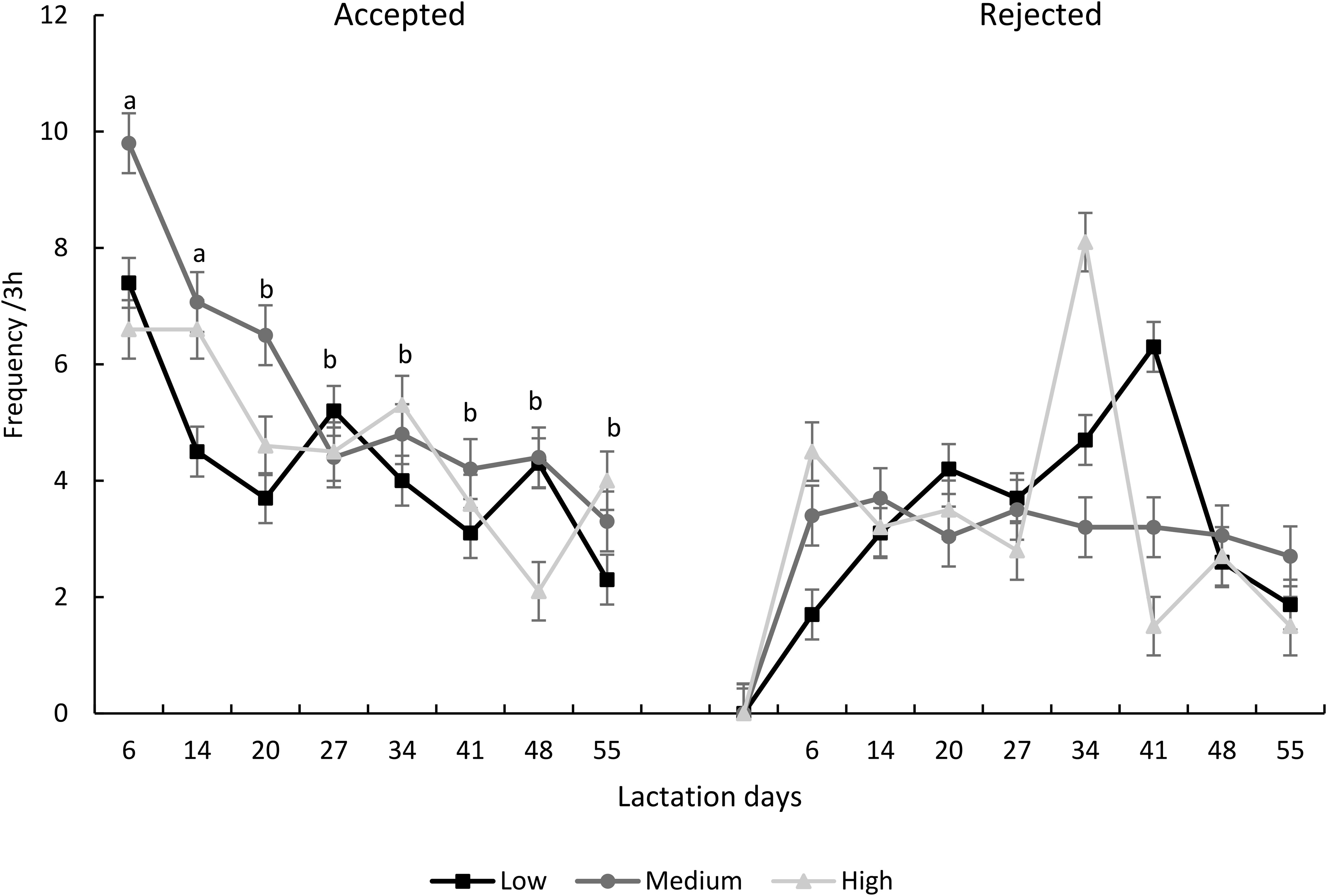 Figure 5. Frequency of nursing episodes (mean ± SEM) that were accepted or rejected by the dam during different stages of lactation, according to dominance level. For acceptance episodes, different letters indicate differences over time (P< 0.05). No significant differences were observed for rejection episodes (P > 0.05).