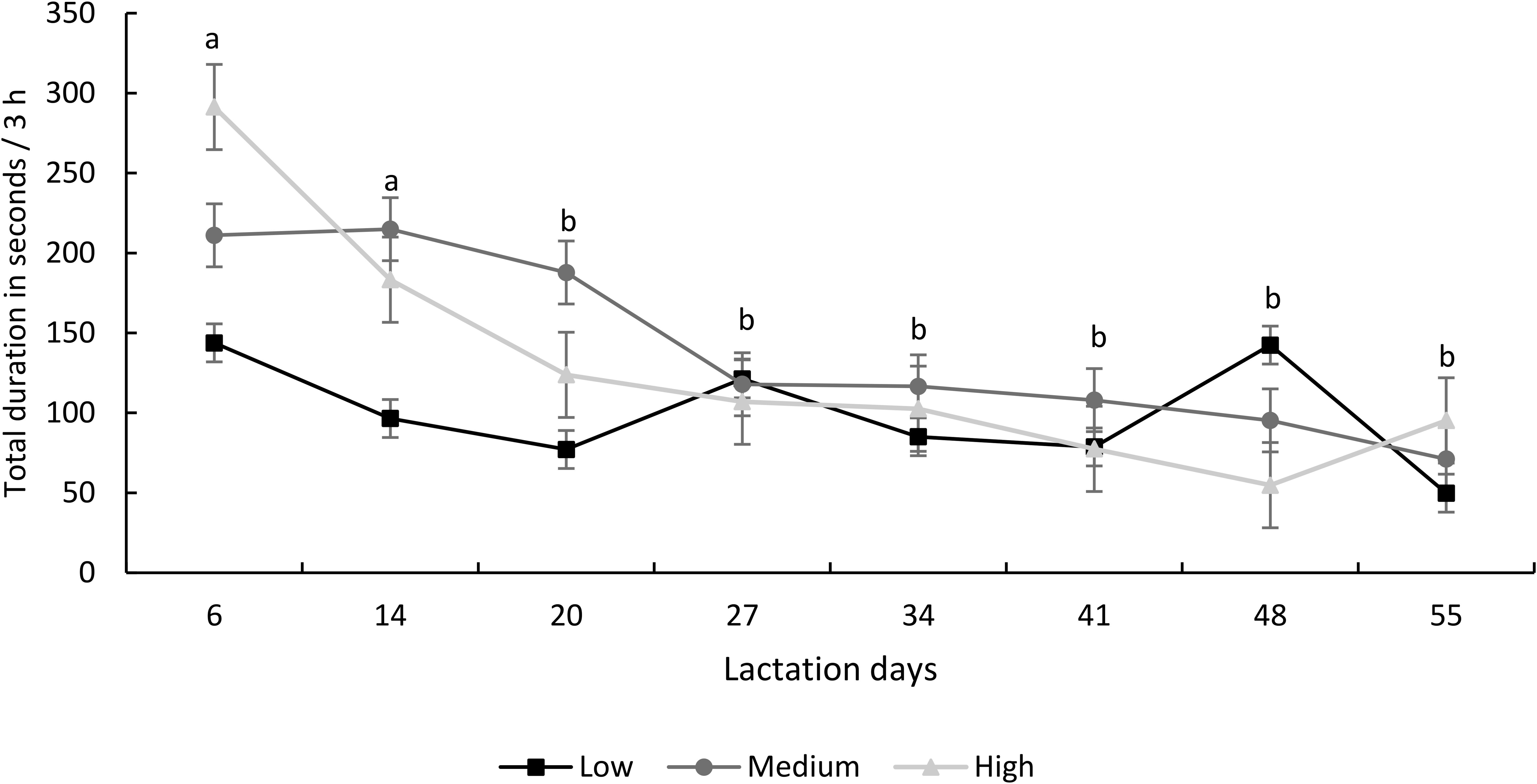 Figure 6. Duration of nursing episodes (mean ± SEM) during different lactation stages, according to the dominance level. Different letters indicate differences over time (P< 0.05).