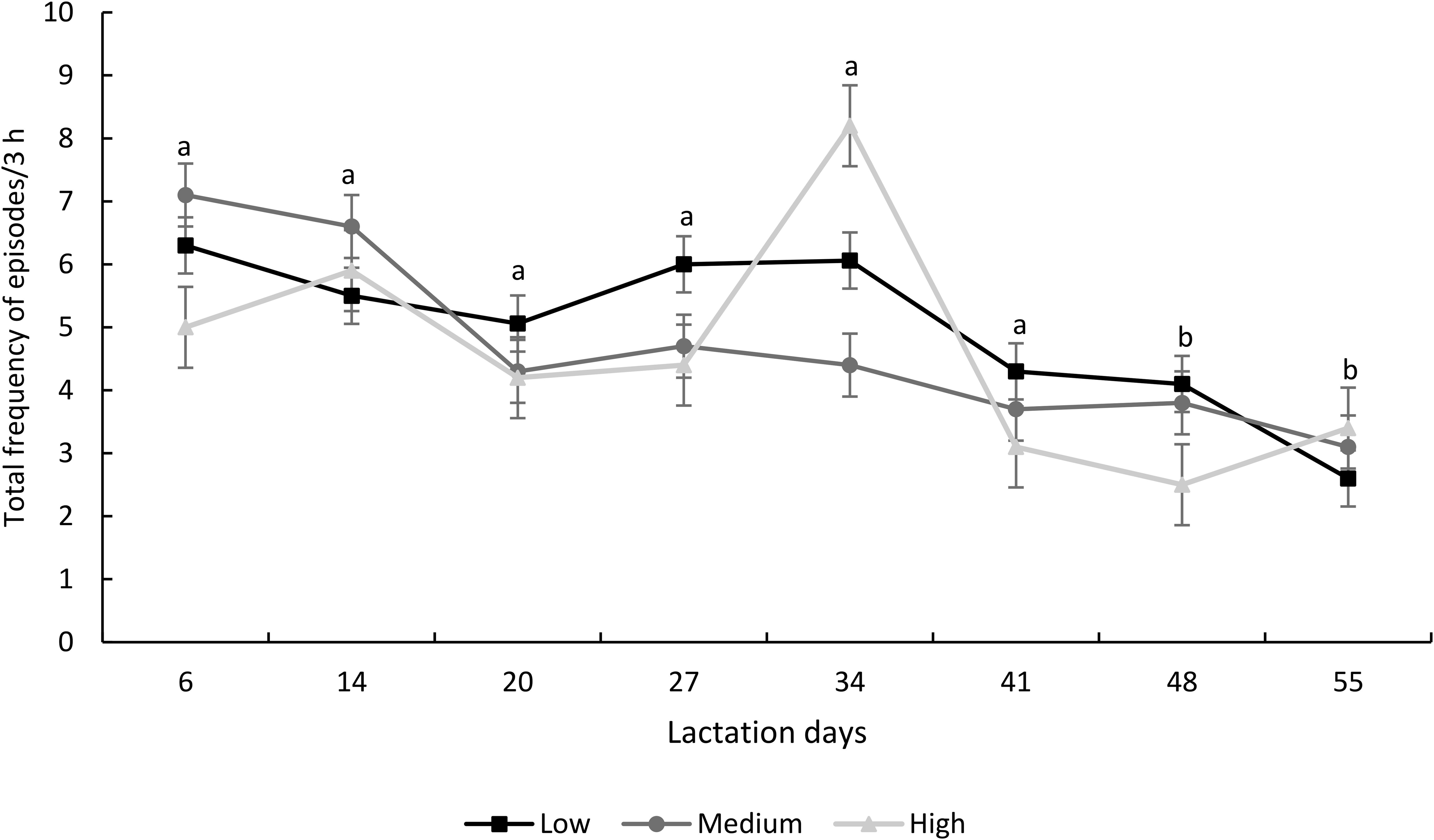 Figure 7. Frequency of total nursing episodes (mean ± SEM) during different lactation stages, according to the dominance level. Different letters indicate differences over time (P< 0.05).