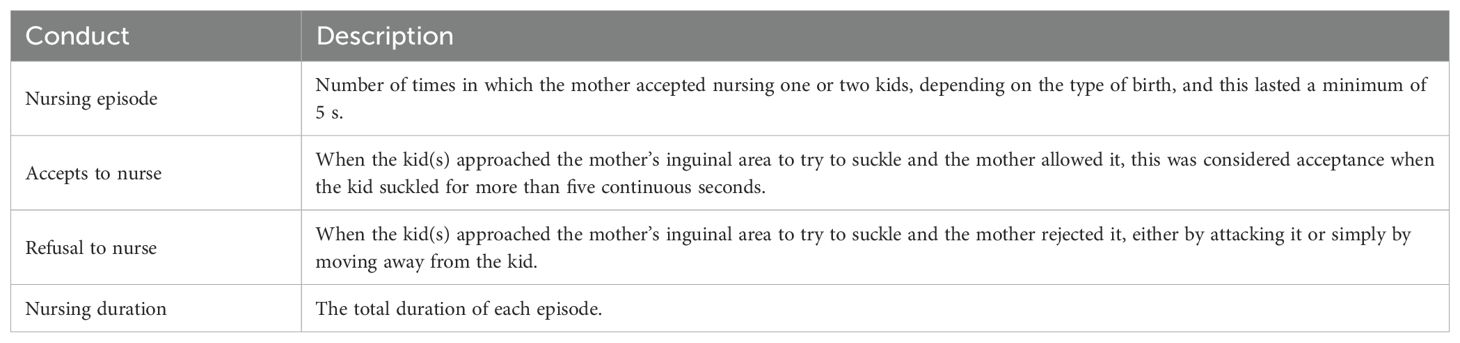 Some lactation variables in goats are positively correlated with milk production as is the case with weight of kids (García et al., 2017; Erduran, 2023). Therefore, a positive mother–young relationship can be guaranteed with adequate milk production. In ungulates, the first few hours postpartum are an intense period of interaction between the mother and her litter. This leads to unrestricted access of the offspring to the udder and the establishment of a lactation rhythm (Poindron et al., 2007b; Hernández et al., 2012). However, the frequency of this rhythm varies depending on the species and stage of lactation, and the exclusive mother–offspring bond (Lickliter, 1985; García et al., 2017). Furthermore others factors such as maternal hierarchy may be related to this process. A study conducted on goats in a semi-desert climate found that those with a high social rank had better productive parameters in the prepartum and postpartum period. However, these advantages were not reflected in the productive development of their offspring during lactation (Flores-Salas et al., 2025).