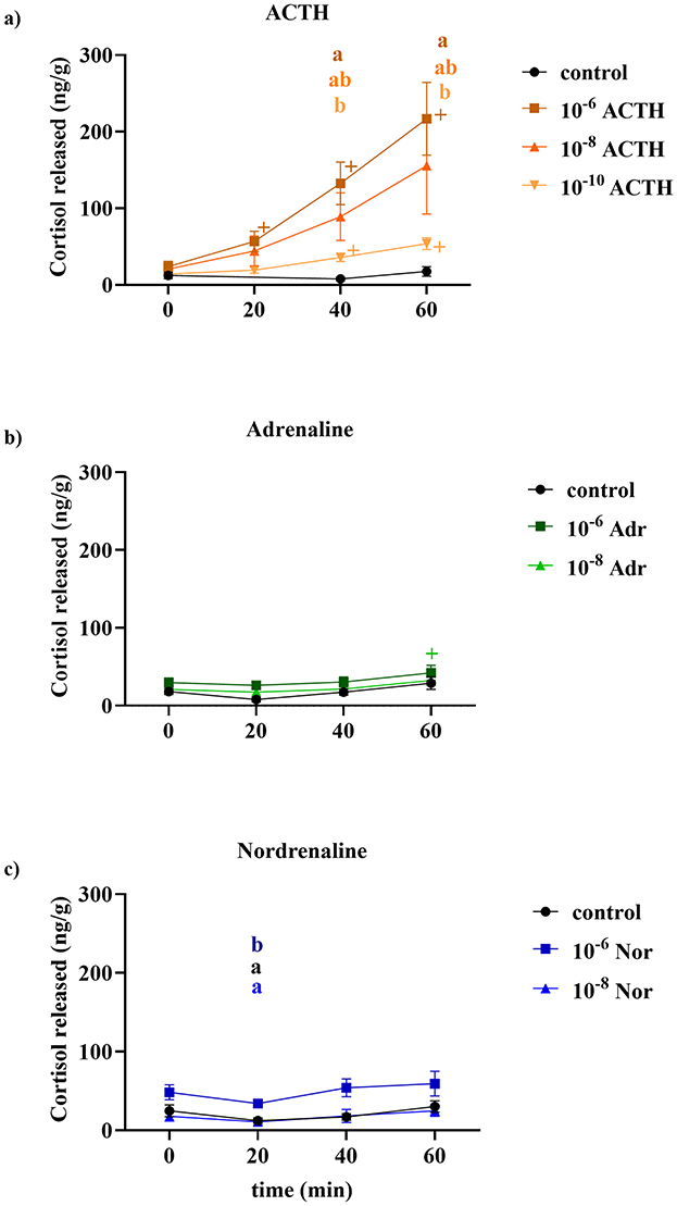 Figure 1. Cortisol release (ng/g tissue) over time (min) in response to different concentrations of (a) ACTH, (b) adrenaline (Adr), and (c) noradrenaline (Nor). ACTH was tested at 10−6, 10−8, and 10−10 M, while adrenaline and noradrenaline were tested at 10−6 and 10−8 M. Each treatment was compared to a control group. In the ACTH group the control was exclude for statistical analyses due to the 20 min time point being missing. Data are presented as mean ± SEM (n = 6 per group per time point). The “+” indicates a significant difference between values at each time point compared with their value at 10 min. Different letters at a given time point indicate significant differences between treatment groups (p < 0.05).