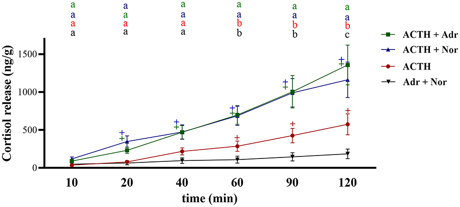 Figure 2. Cortisol release (ng/g tissue) over time (min) from head kidney fragment in response to the induction of medium containing ACTH alone, ACTH in combination with adrenaline (ACTH + Adr), ACTH in combination with noradrenaline (ACTH+Nor), or adrenaline and noradrenaline (Adr+Nor). ACTH concentration in the media was 10−6 M, while it was 10−7 for adrenaline and noradrenaline. The “+” indicates a significant difference between ACTH (red), ACTH+Adr (green), ACTH+Nor (blue), and Adr+Nor (black) values at each time point compared with their values at 10 min. Letters indicate significant differences between the treatments at each time point. Values are considered different when p < 0.05.