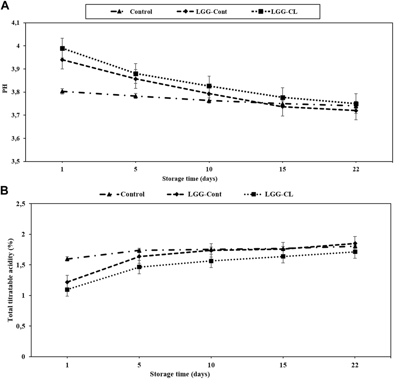 FIGURE 2. pH (A) and total titratable acidity (as lactic acid %) (B) of different formulations of kurut during storage at 4°C. Control, Kurut produced from kefir grains; LGG-Cont, Kurut containing LGG; LGG-CL, Kurut containing LGG and C. laurentii. Error bars represent the mean (n = 3) ± standard deviation (SD).