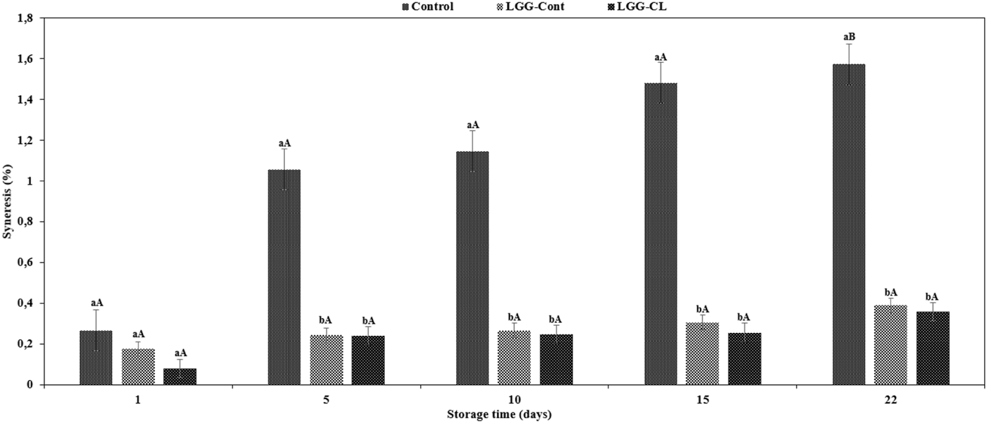 FIGURE 3. Syneresis (%) of different formulations of kurut during storage at 4°C. Control, Kurut produced from kefir grains; LGG-Cont, Kurut containing LGG; LGG-CL, Kurut containing LGG and C. laurentii. Different lowercase letters indicate significant differences (p < 0.05) between samples at the same storage time point, and same uppercase letters indicate non-significant differences (p > 0.05) between the storage days of each kefir sample. Error bars represent the mean (n = 3) ± standard deviation (SD).